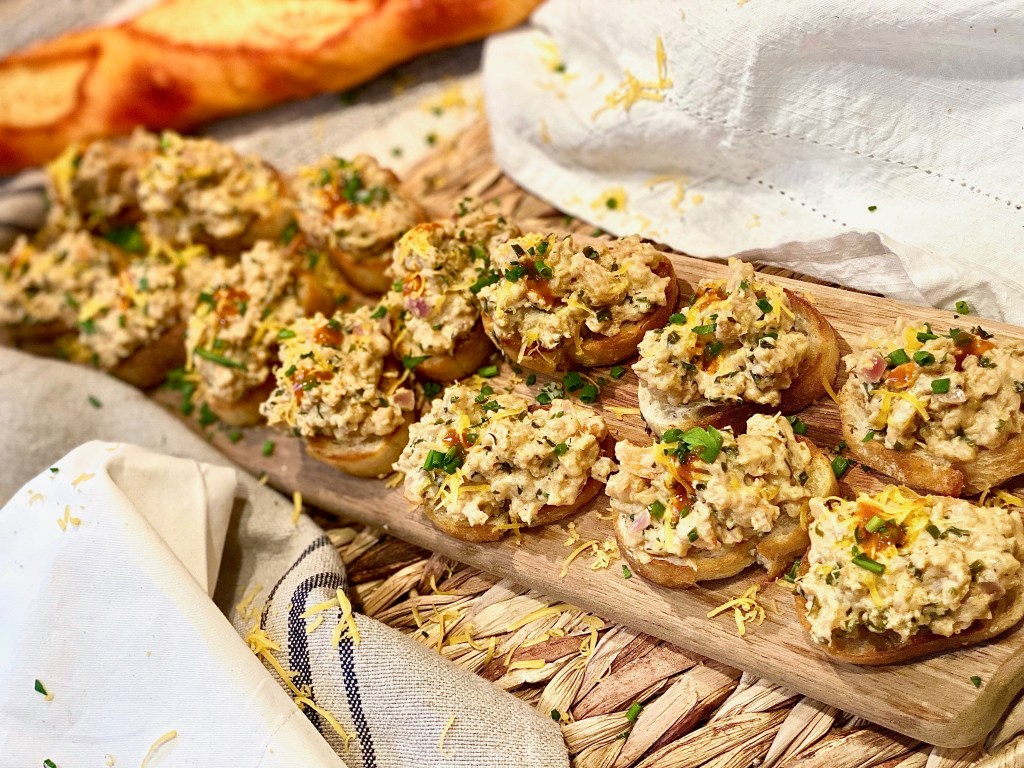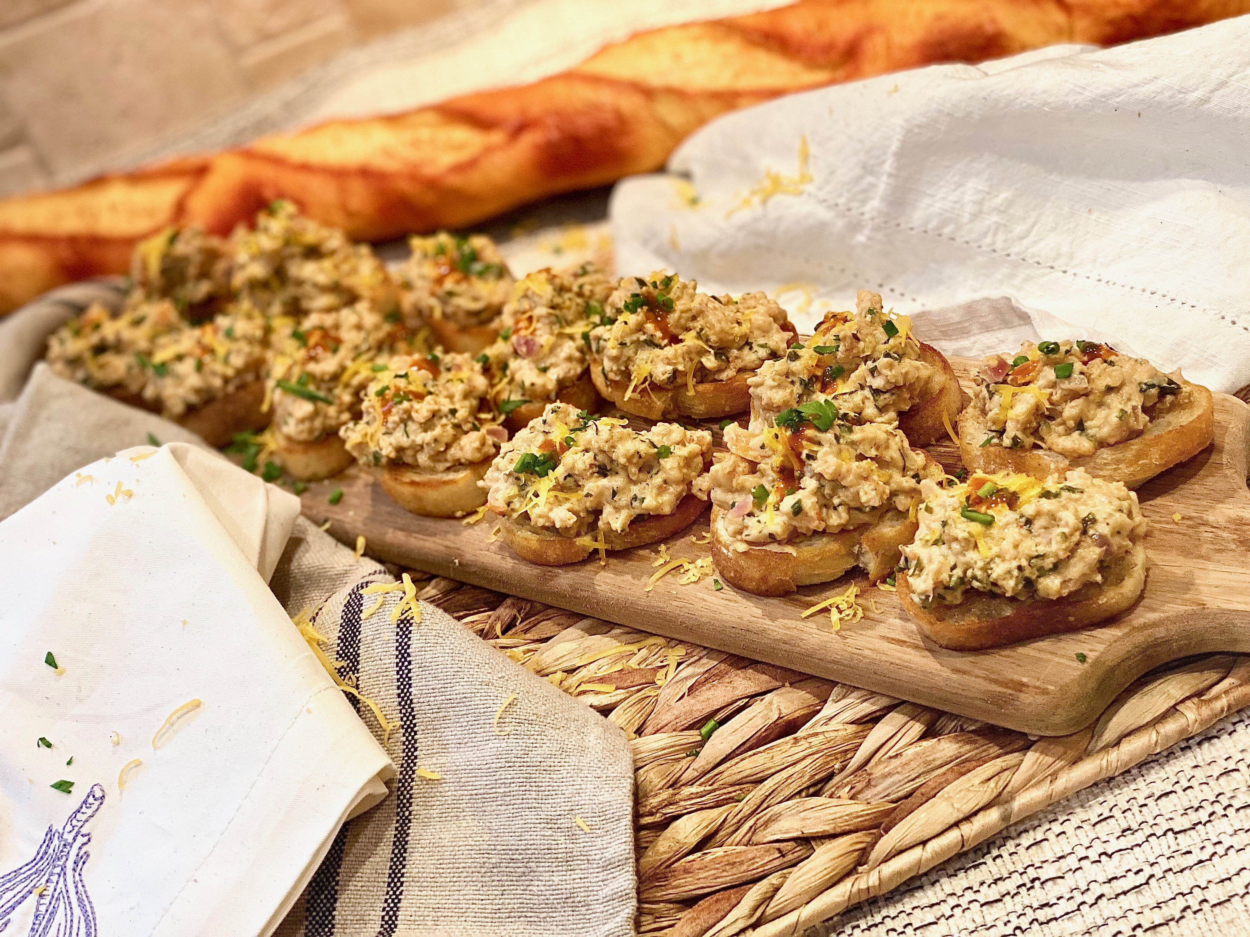 Pile a spoonful of the shrimp rangoon mixture on top of each toasted baguette. Then, garnish with fresh chives and extra cheddar cheese.
