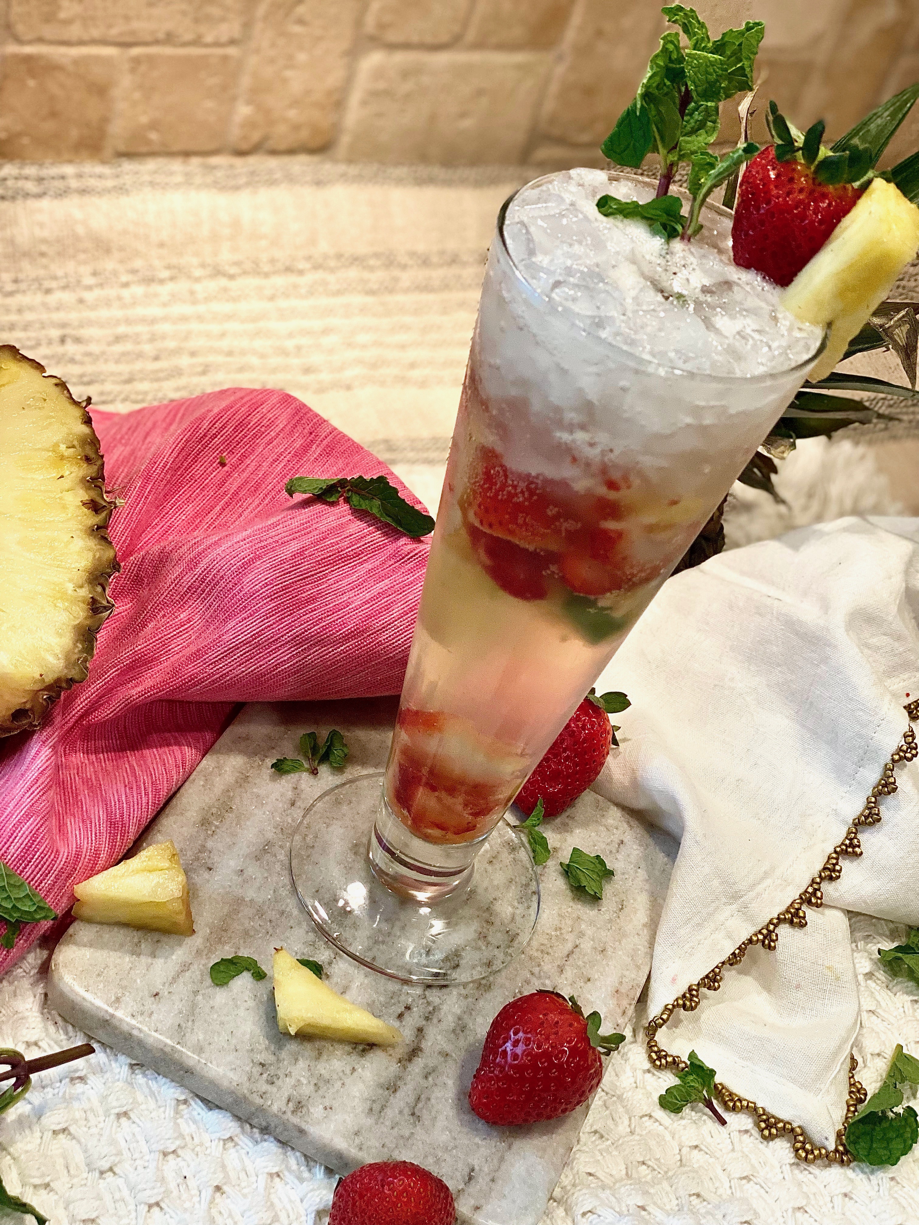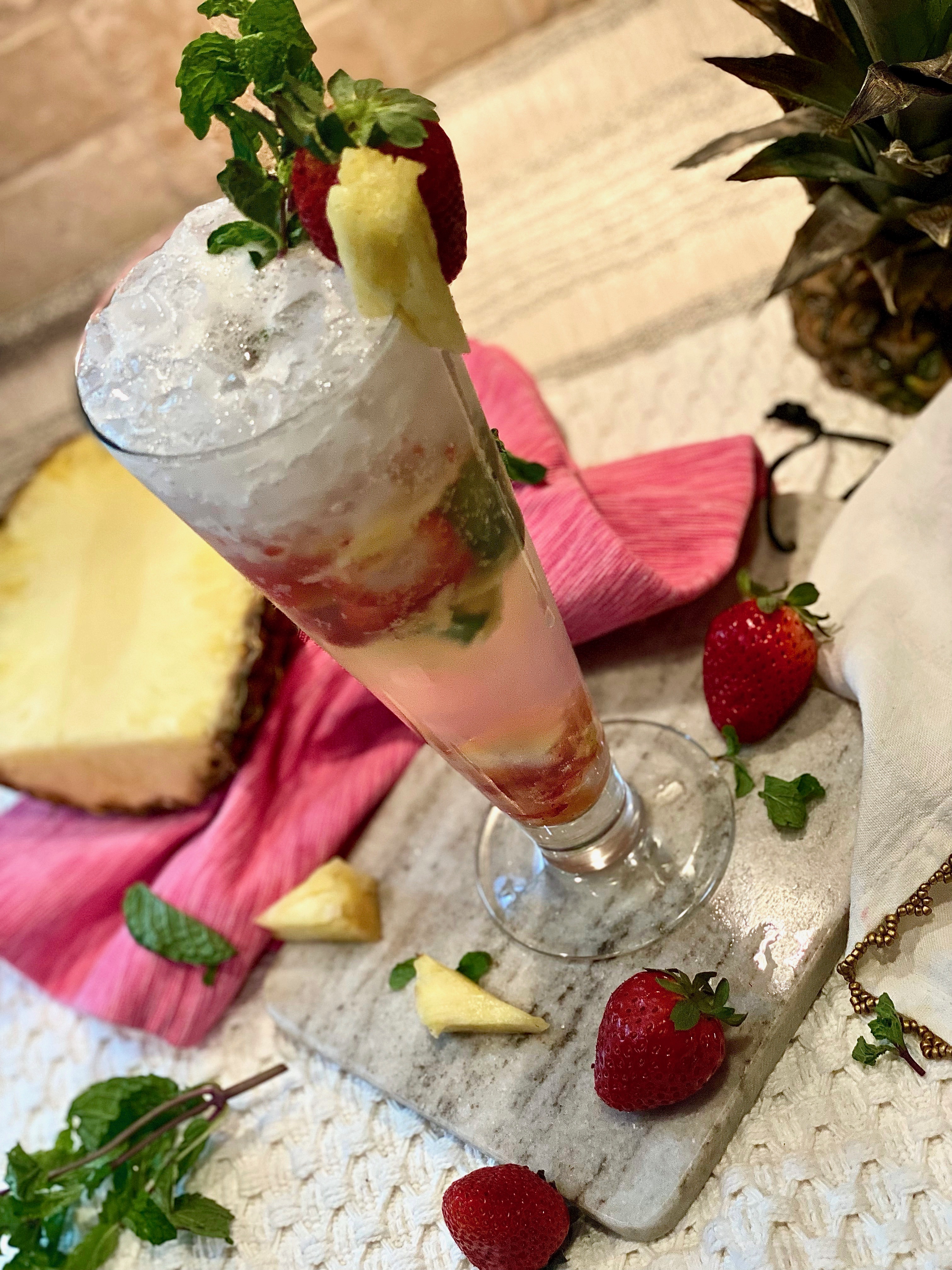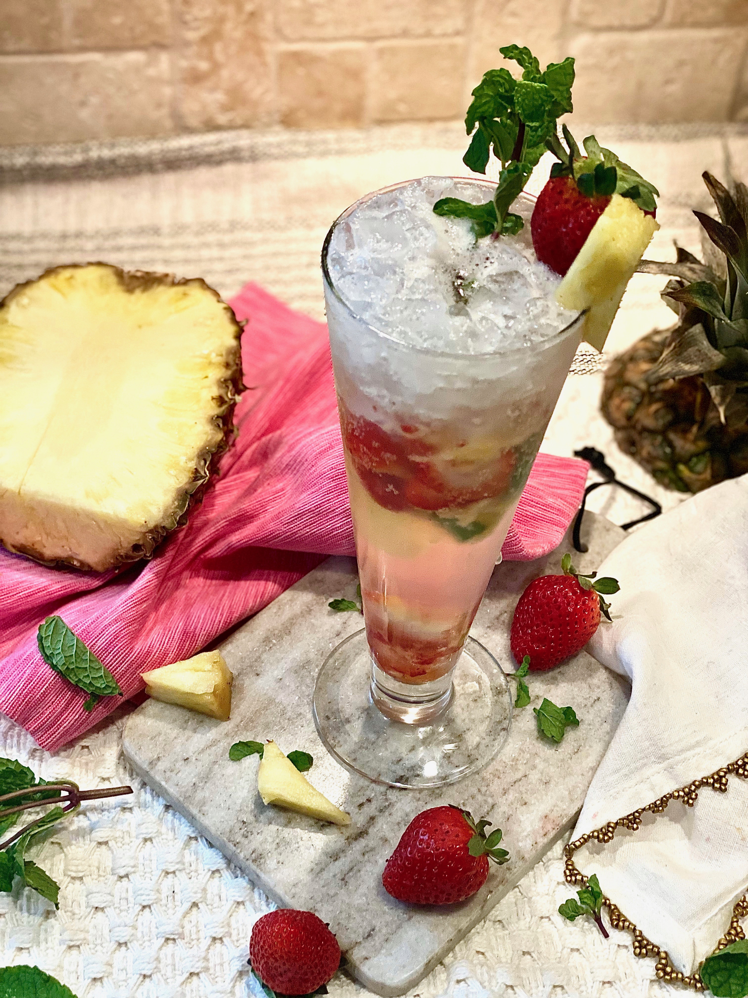 - Garnish with a sprig of fresh mint, a whole strawberry, and a chunk of pineapple! I like to garnish my drinks with whatever I have inside of the beverage because then your guest, or whoever you’re serving it to will know what the ingredients are without having to ask.