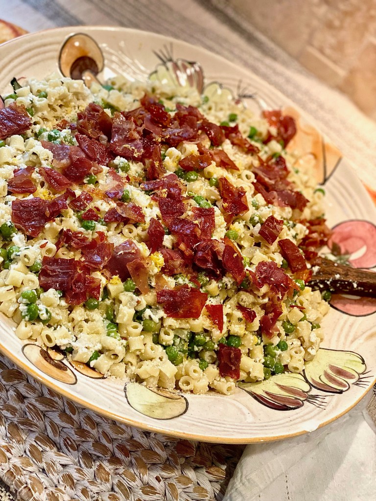 Once you start making Italian peas and pasta in your house, it will become a weekly staple. It’s something everyone loves, even the ones who say they don’t like peas. When you use fresh peas that are frozen it makes a huge difference then if you were to use peas straight out of the can. Two completely different colors and textures! Also, PSA announcement do not skip on the crispy prosciutto. It makes this dish! If you love bacon, there’s absolutely no reason in the world you wouldn’t be into the flavor it brings to sweet peas and the creamy pasta.