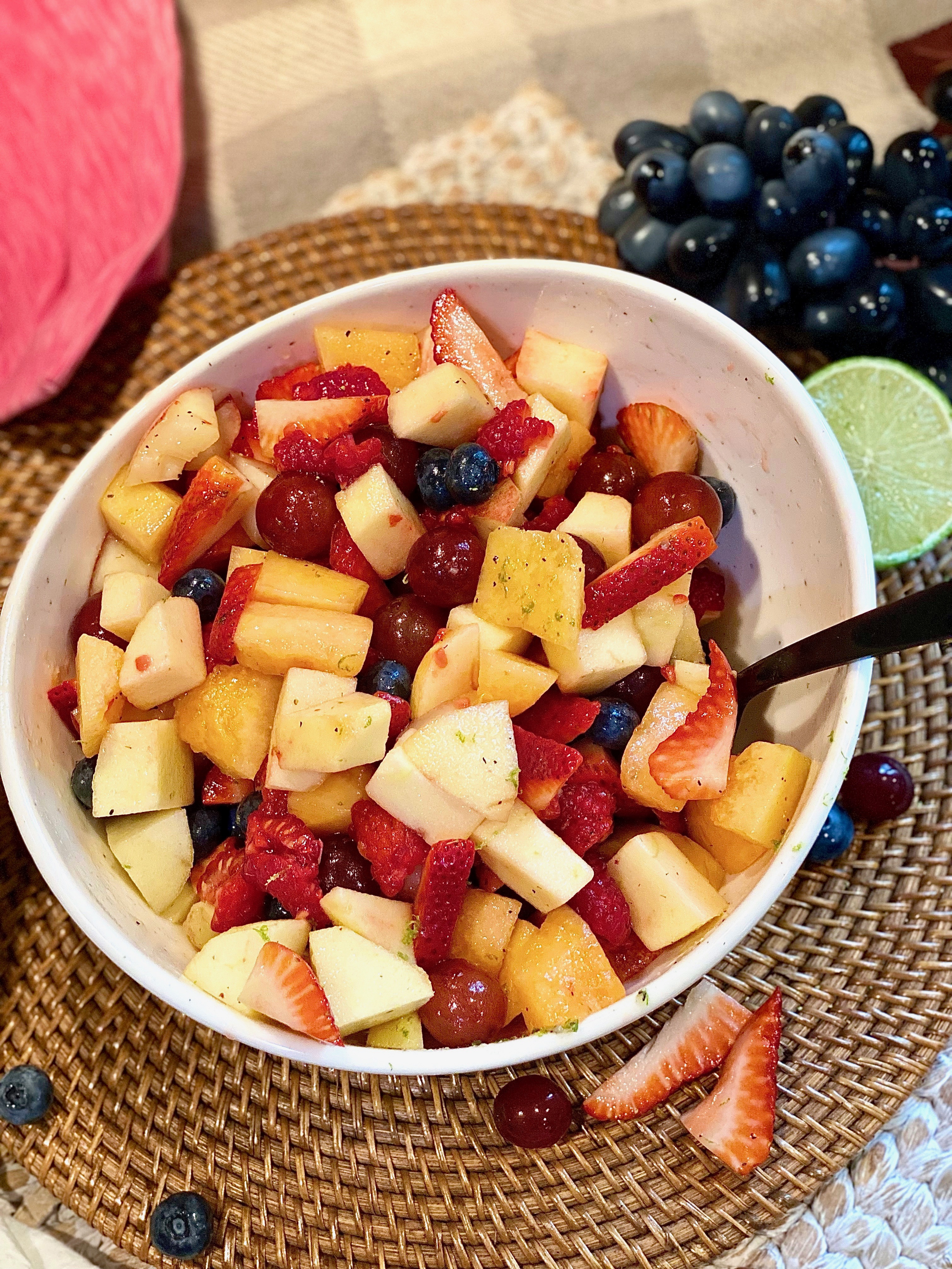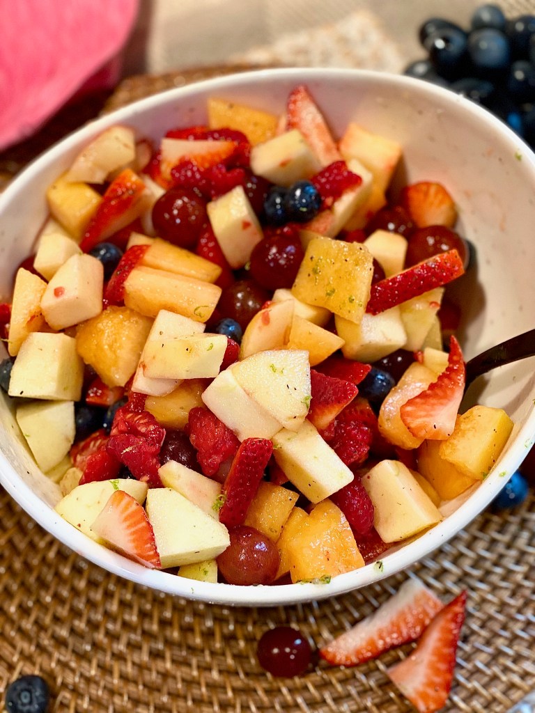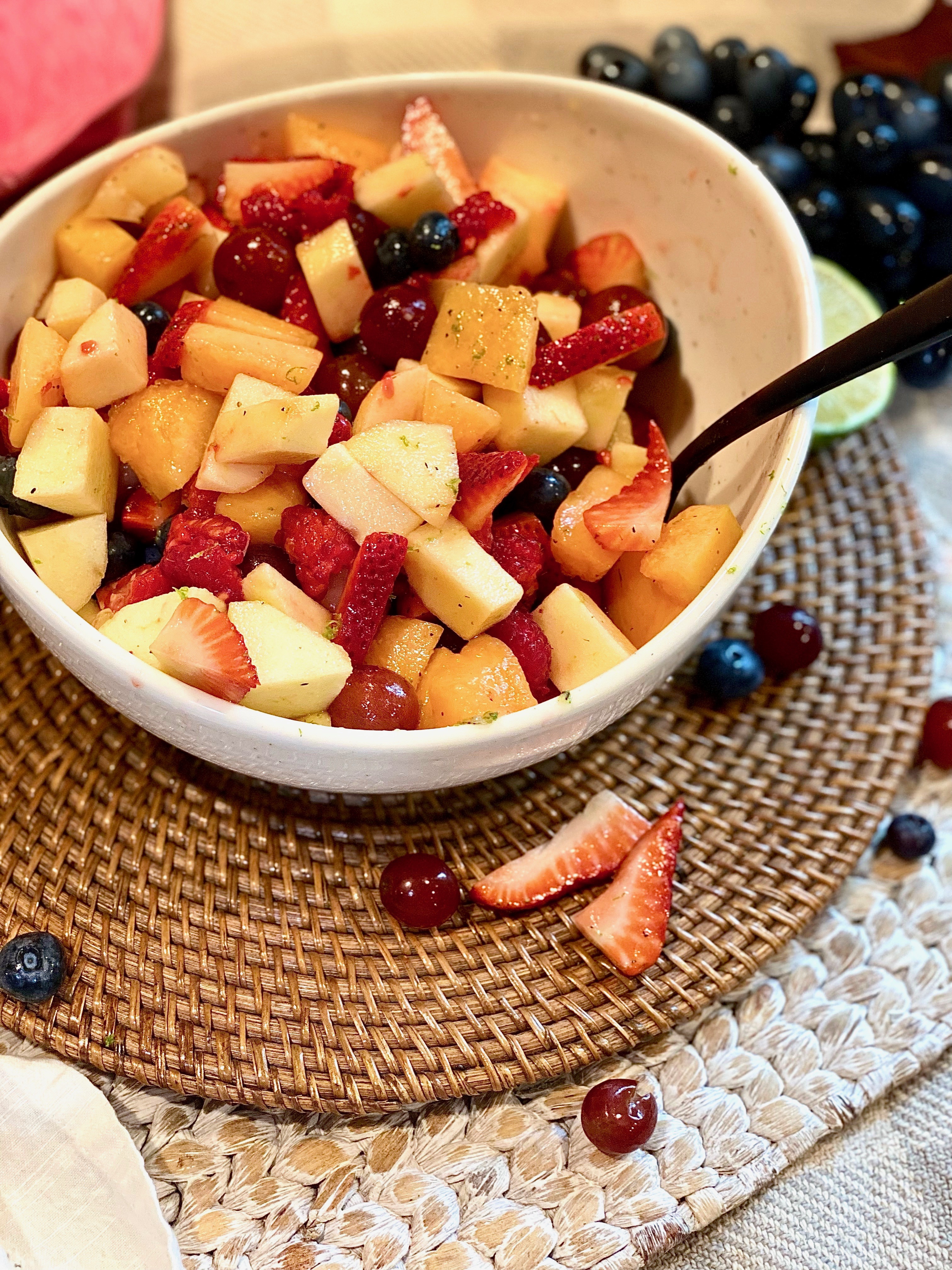 Back in the spring I was influenced by a beautiful creator on social media named Leah Victoria to make a “clean out your fridge” pasta salad. It came out wonderful and it was absolutely delicious! That was the concept that I wanted for this fruit salad recipe that you see here. This is the perfect thing to make right now since we are in the dead of Summer and it’s full on pool weather! Speaking of pool, this is an excellent snack to have while you lounge poolside watching your kids swim and play around. It’s also great for cookouts, dinner parties on the deck, or any type of gathering outside! This is a great dessert substitute if you’re trying to be super healthy this year like I am!