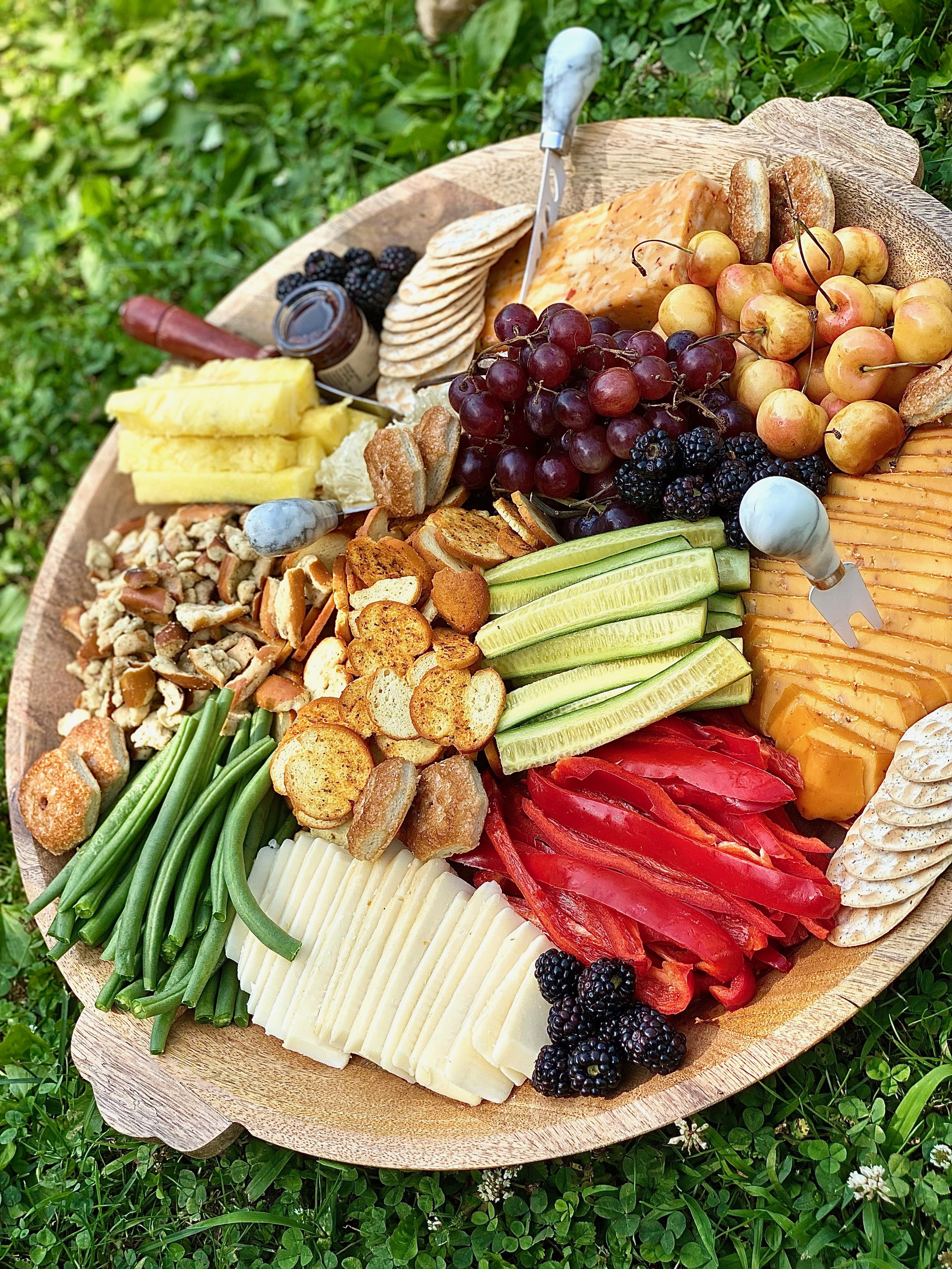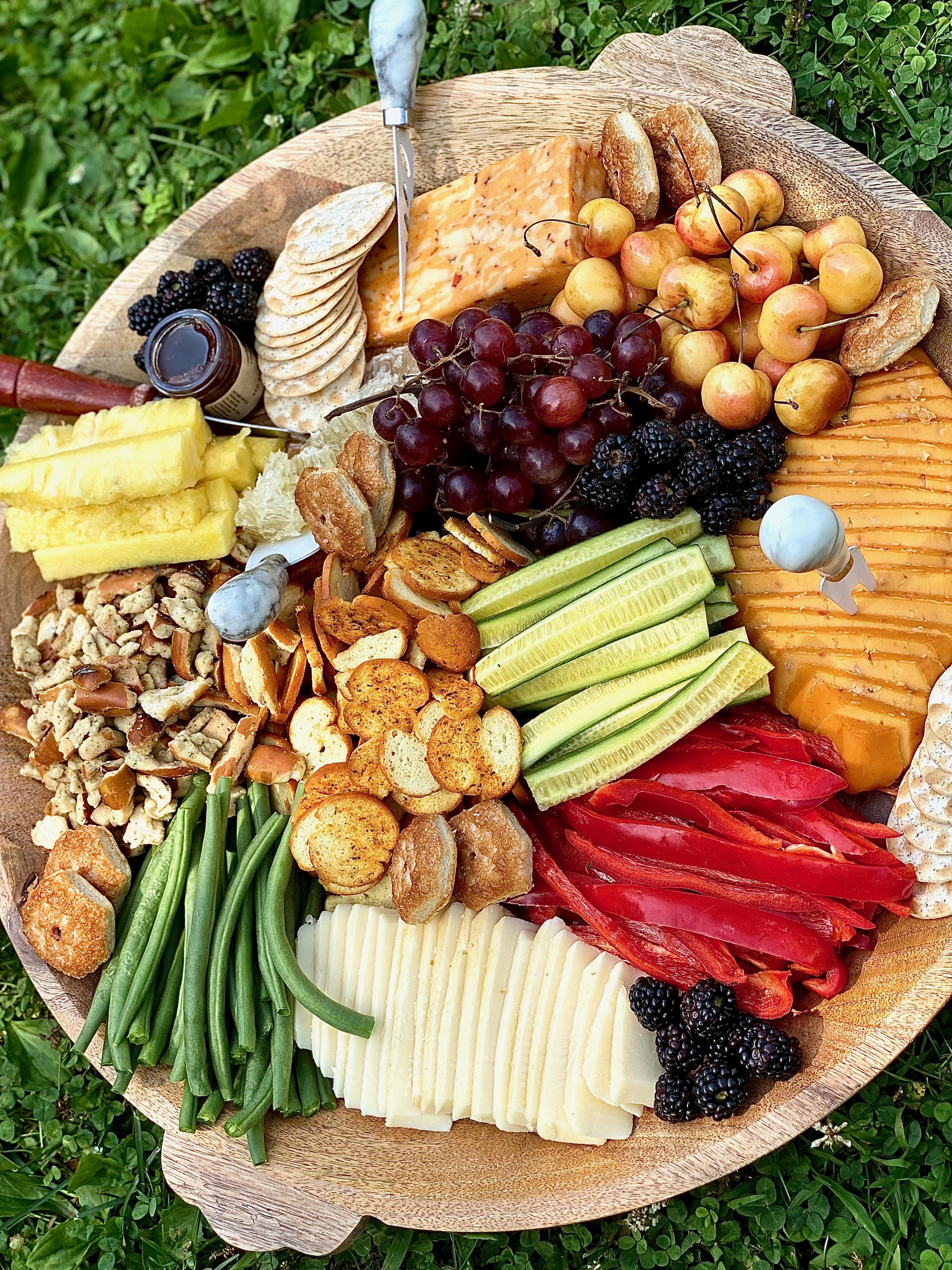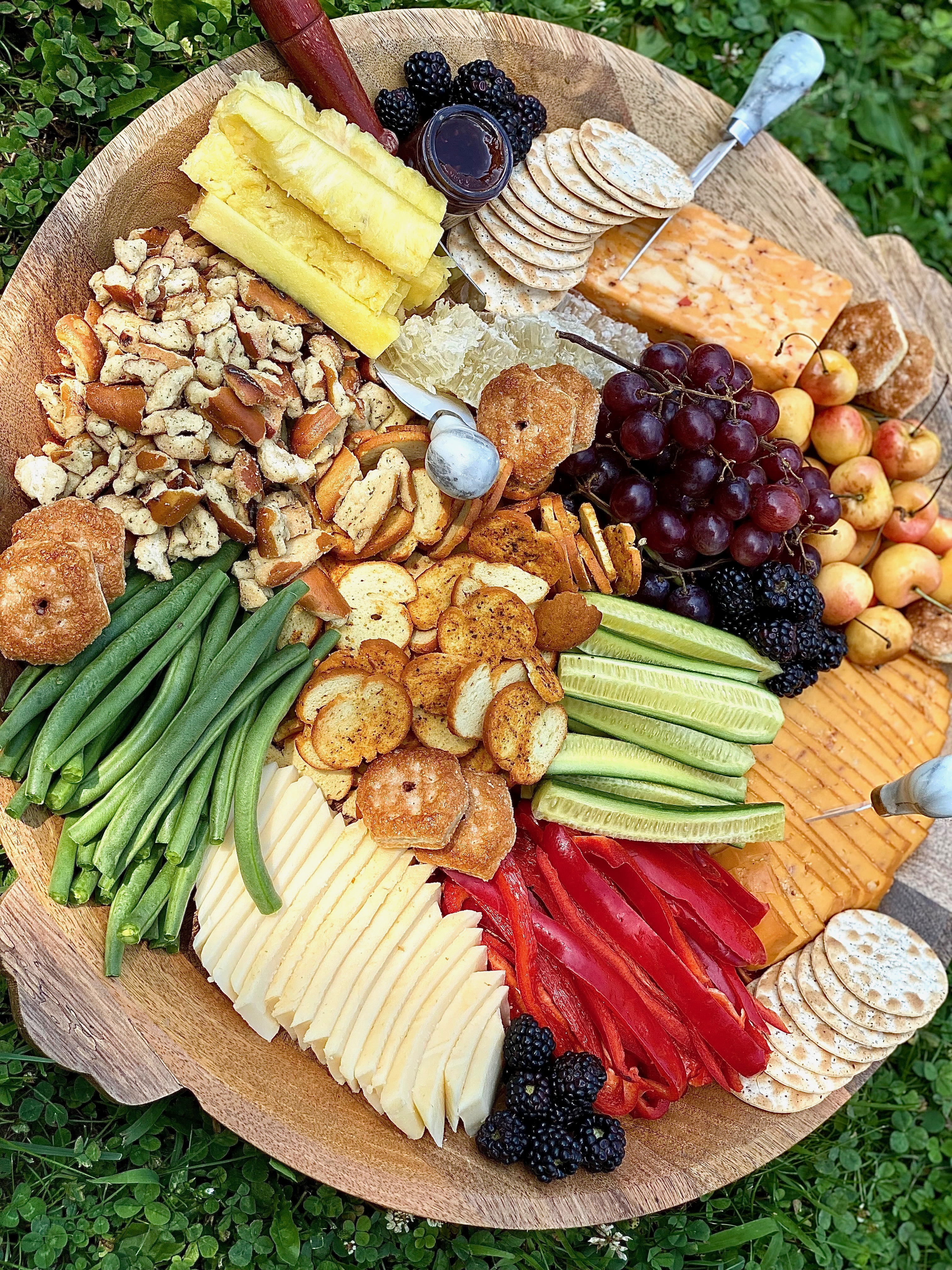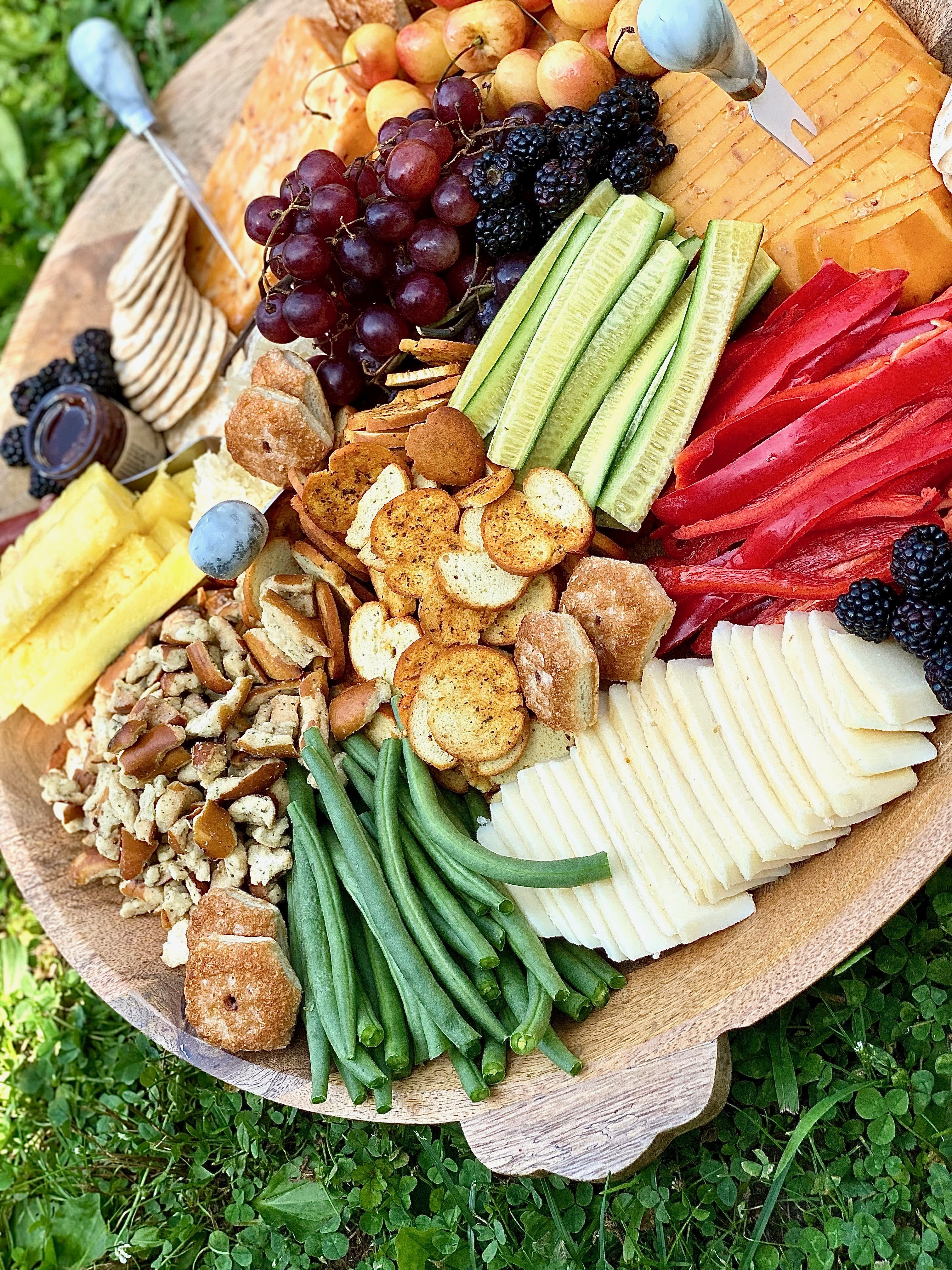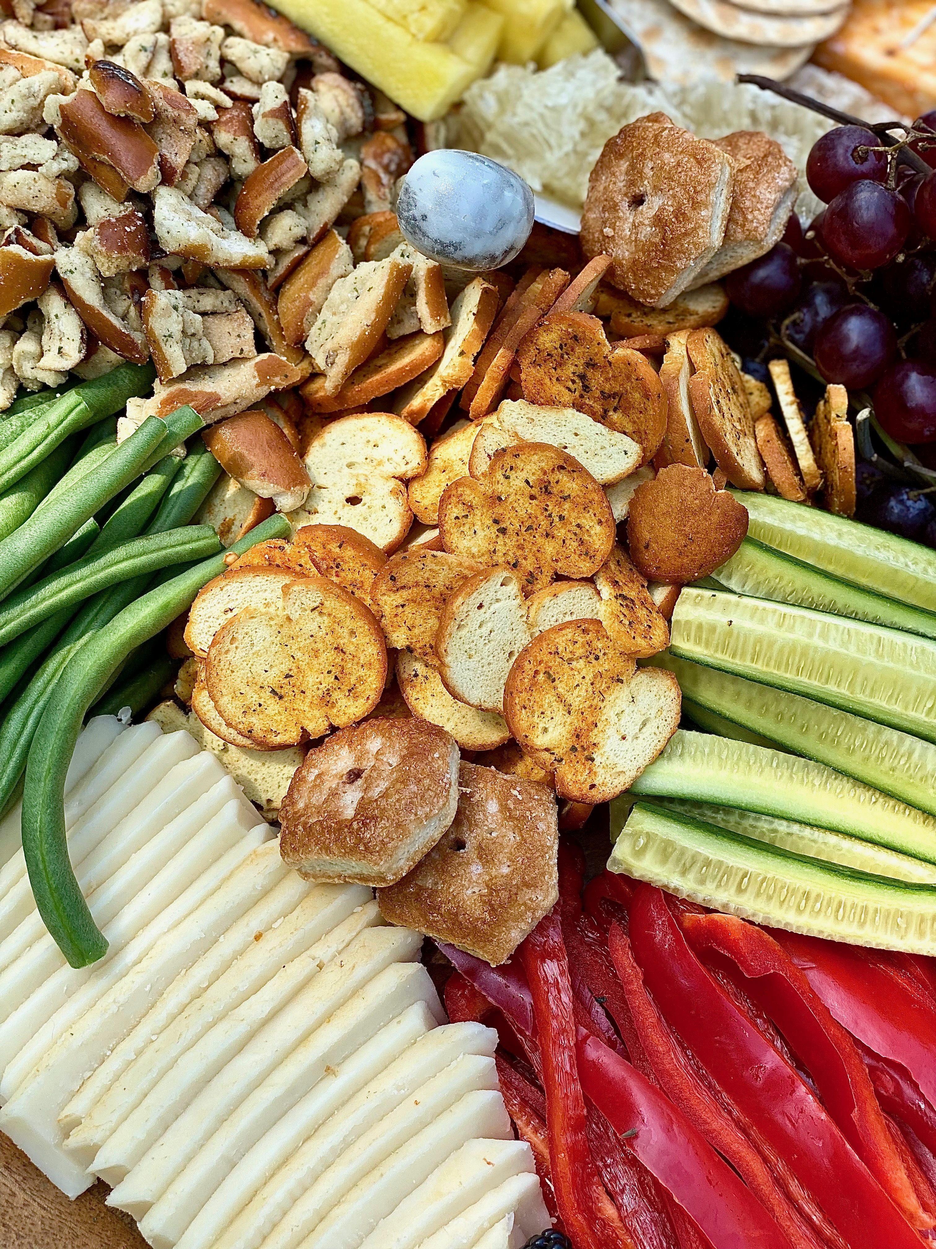 You can call this a charcuterie board if your heart desires, however, it’s technically not one! Charcuterie means cuts of meat and cheese, so when the board does not contain any piece of meat, it’s just a cheese board! There is absolutely nothing wrong with that though! Sometimes it’s pretty magnificent to pair different flavors of cheese with variations of vegetables, fruits, and sugary-sweet bites. Last weekend I wanted to construct a crunchy, sweet, savory, and salty board for my boyfriends family. We had planned on having a cookout, enjoying each others company, and ending the night with some bean bag toss. If you’ve never played it, you should! It is seriously such a fun and exciting game to play in groups, especially if your loved ones have a little competition side built in them. As I mentioned in a pervious post I am on the biggest fitness journey I’ve ever been on. I have recently lost 34 pounds and am still striving for more! I’m feeling just wonderful! Eating loads of clean foods has really been a large contributing factor in the whole entire process. Cody’s family is also on their own health journey’s, so I definitely wanted to make sure that this board had been built with love and lots of hearty, whole foods. Just like on most boards you have to throw on some crunchy goodies and sweet treats! However, for the most part this board is quite healthy.