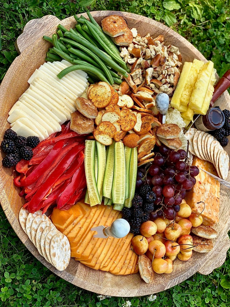 If you’re anything like me you plan weeks or even a month ahead of time, so you should be onto your Labor Day menu planning by now! This board will be perfect to sit alongside all of your barbecued items and a mixed berry trifle. It doesn’t matter if you’re grilling hot dogs, chicken kabobs, shrimp, a NY strip steak, or all of the above. Everything will go perfectly fine together. Any sort of get together strives off of a big board such as this. You will not be disappointed! And hey! If you wanted to add meats on to make it an actual “charcuterie” board you are more then welcome to do so. It’s all up to you. Any board, anywhere, for any occasion can be adjusted.
