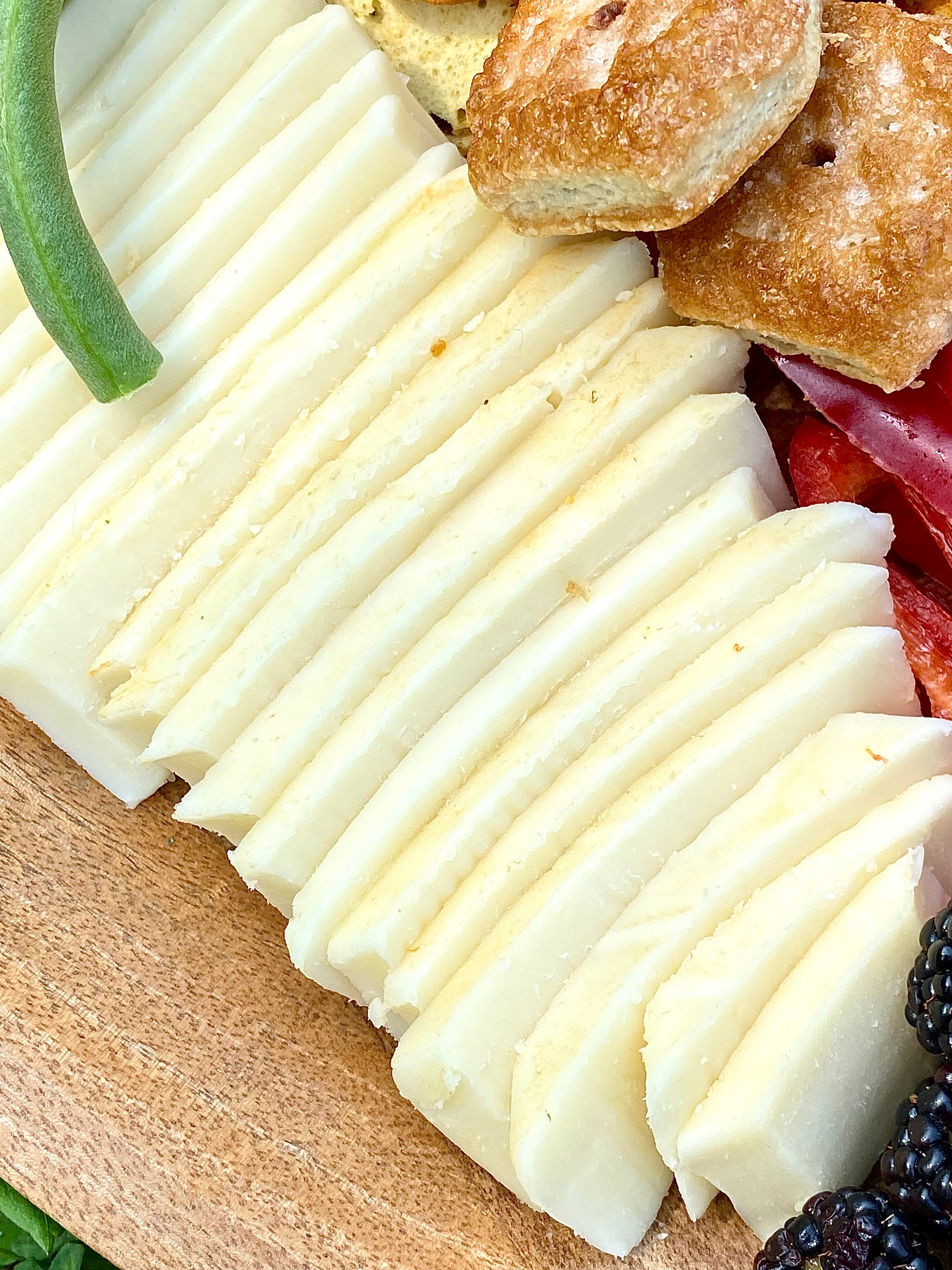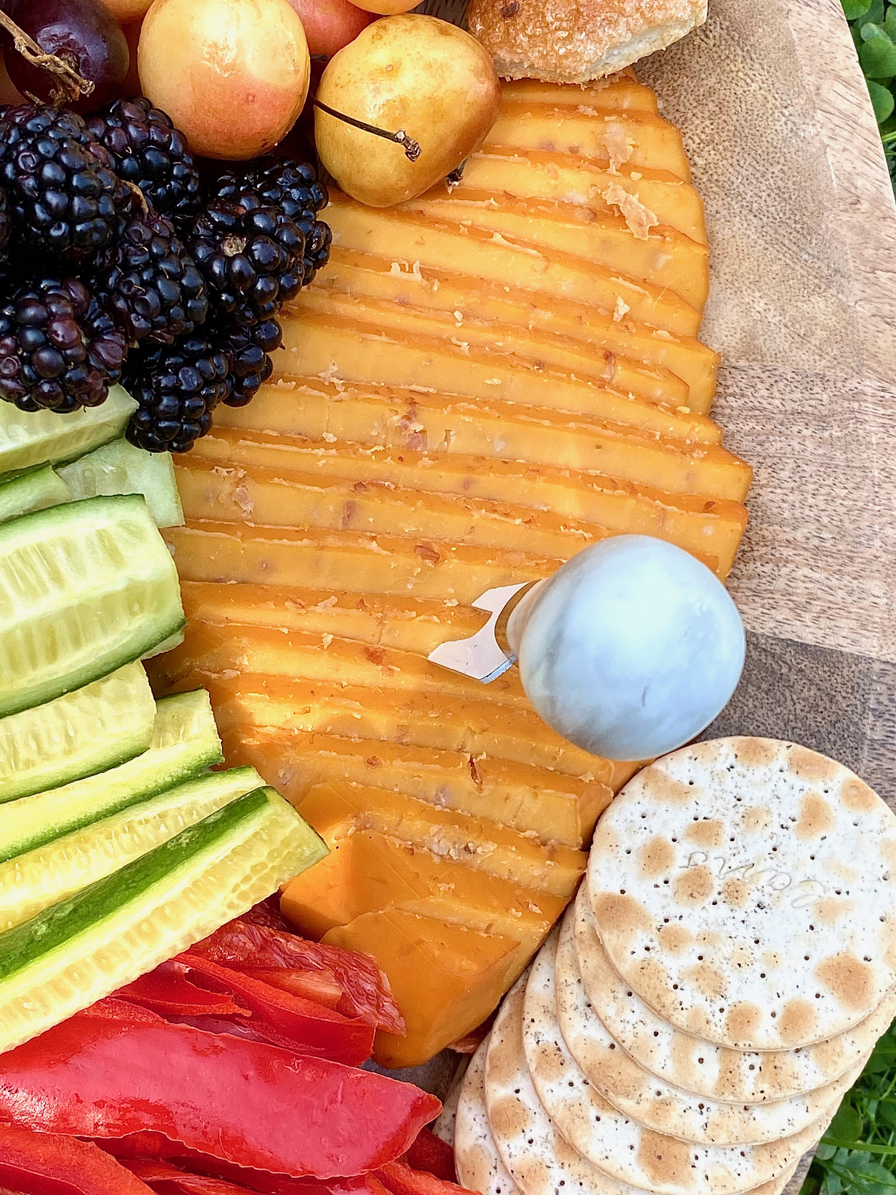 - Lastly, I wanted to add a sharp white cheddar into the mix because I feel like that’s always needed on a cheese board adorned with fruits and vegetables.