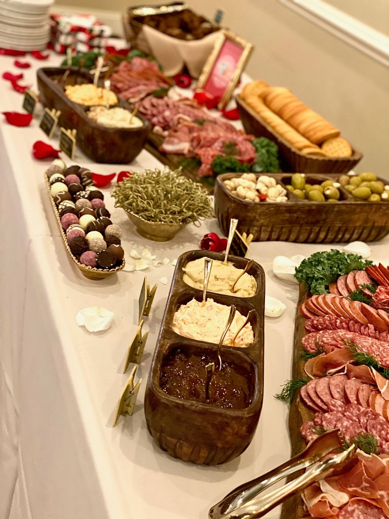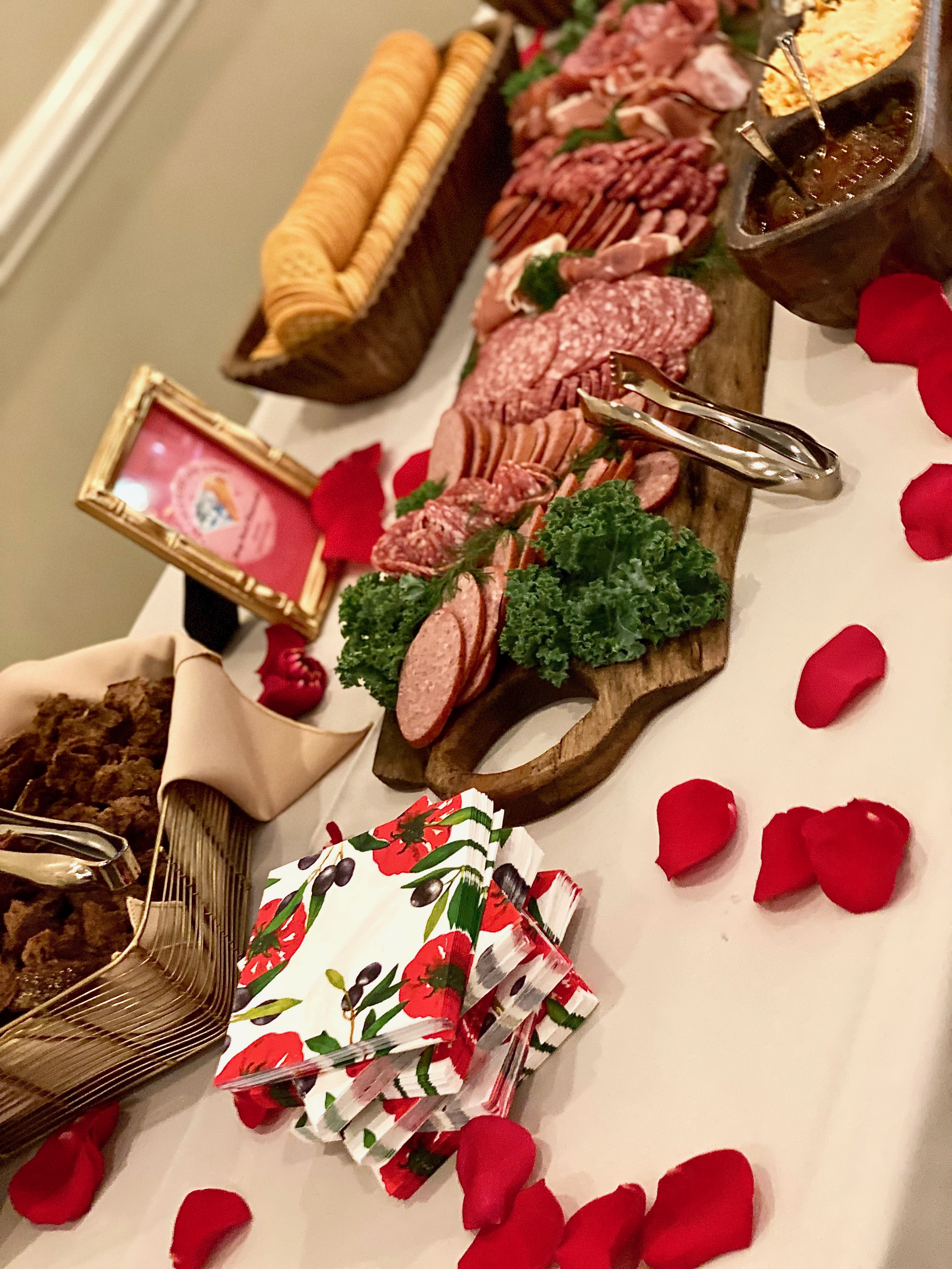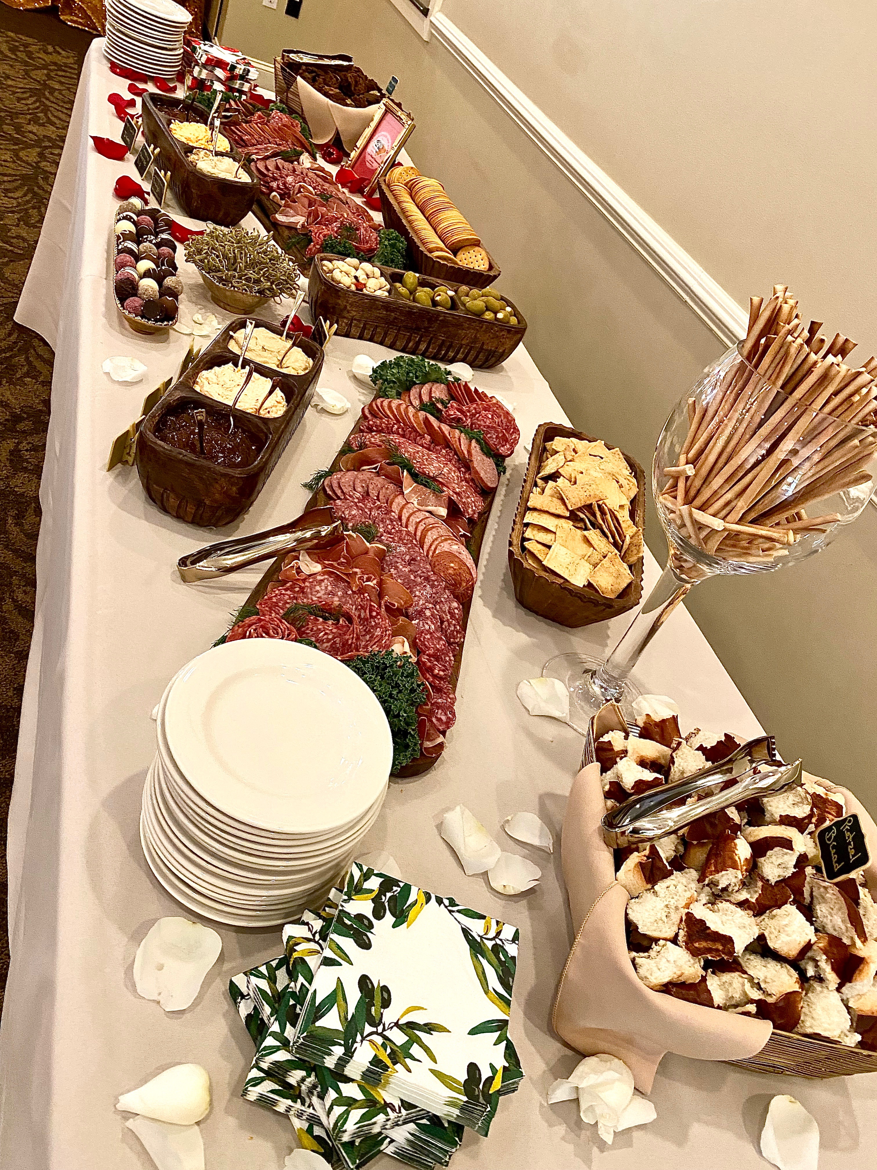 Even though I catered these charcuterie boards at a venue where the wedding reception was being held and there would be plates and utensils there, I did want to provide all of my own tongs, bamboo picks, and napkins for self service. I will continue to do that whenever I have a job where the event is more on classy, upscale side of the spectrum, if they have a party for 50 people or more, or if they request me to provide the tableware. I am absolutely willing to do whatever is requested of me.