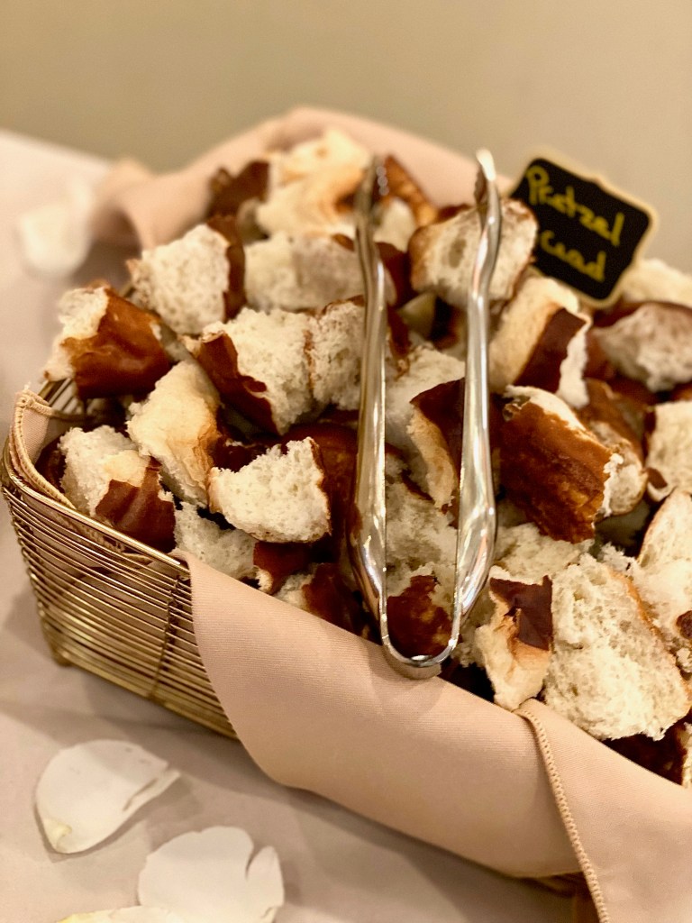 - The pretzel bread on the right hand side is one your guests will never forget. It isn’t the first type of bread you normally think of to add onto your list of charcuterie board adornments. However, it will become one that you’ll think of quite often once you give it that first go around! It goes incredible with various different cheeses, and dips across the board! It is just a wonderful choice to pair with charcuterie.