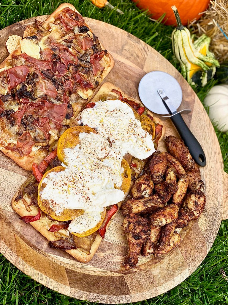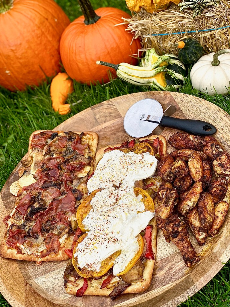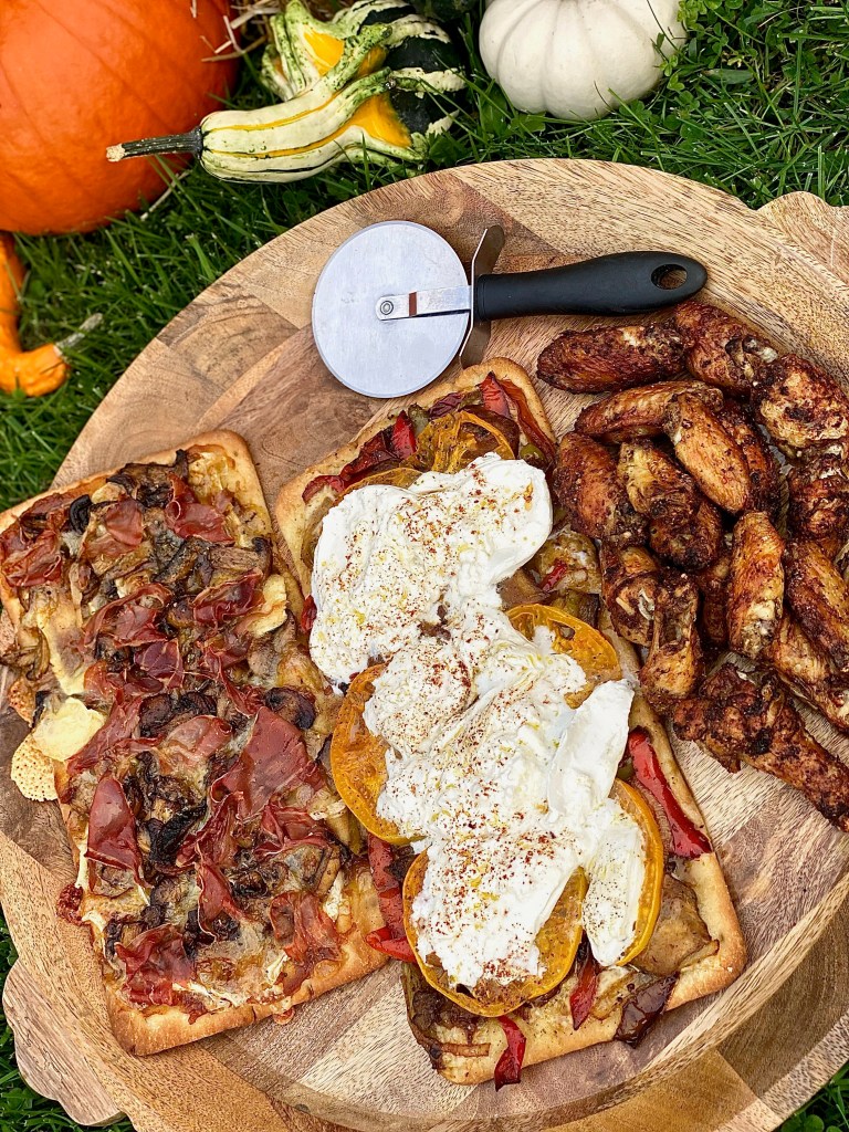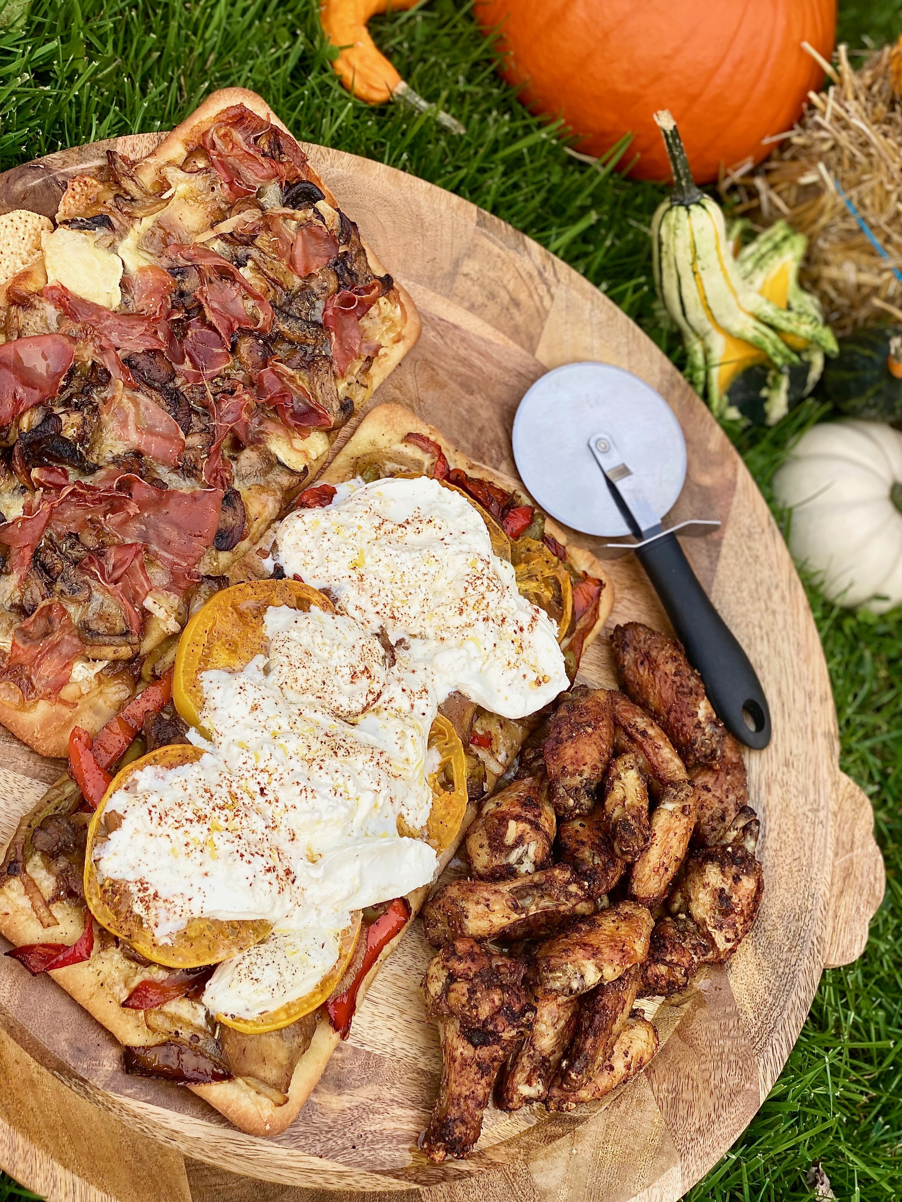 Two wonderful, mouthwatering dishes that NEED to be on your scary movie night menu, your football game day menu, AND especially above all, your Halloween party menu that you should be in the middle of planning right now! As I’m typing this you probably have your pen creating all kinds of coolness on paper or maybe you’re a tech baby and you’d rather plan on a tablet. I mean both work perfectly. Everyone attending halloween parties expect the usual pizza, wings, hoagies, and snack table, but what they don’t expect are five star flat breads and awesome air fried wings to be joining in the frightening festivities on the 31st of this month! October is my absolute favorite month of the entire year and I’ve been planning my weekends for weeks now because I want to live my best life since spooky season comes and goes within the blink of an eye. Last weekend my boyfriend and I had ourselves a little scary movie marathon and of course you can’t have a day filled with watching films without pizza and wings attending the party. However, as most of you know I have lost over 50 pounds since may and have fallen in love with the wellness lifestyle I’ve been living. Therefore, instead of ordered something that I was going to regret eating, and that would probably make me feel like crap afterwards I said “let’s make our own healthy flatbreads and air fried wings”. They’ll both taste even better and they’ll be much better on the stomach. In the fall I find myself loving being in the kitchen even more so then any other time of the year.