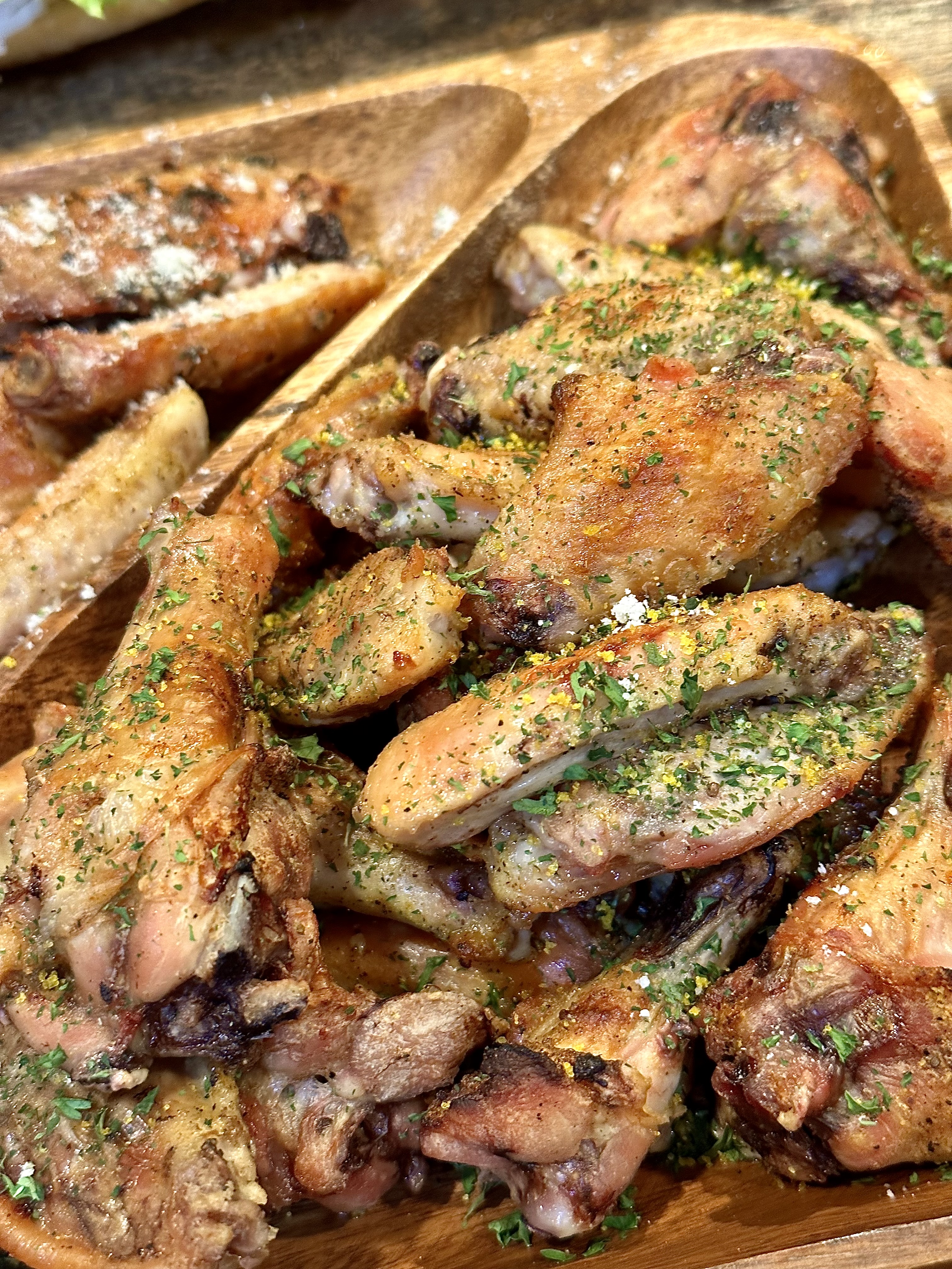 I did half the wings parmesan garlic, lemon pepper and the other half I did a sweet herbed soy! They both sound a little much, but that’s my vibe and I LOVE a mixing flavors! It’s such an epic adventure for your taste buds and your guests will go wild over them. You will definitely need to make multiple batches.