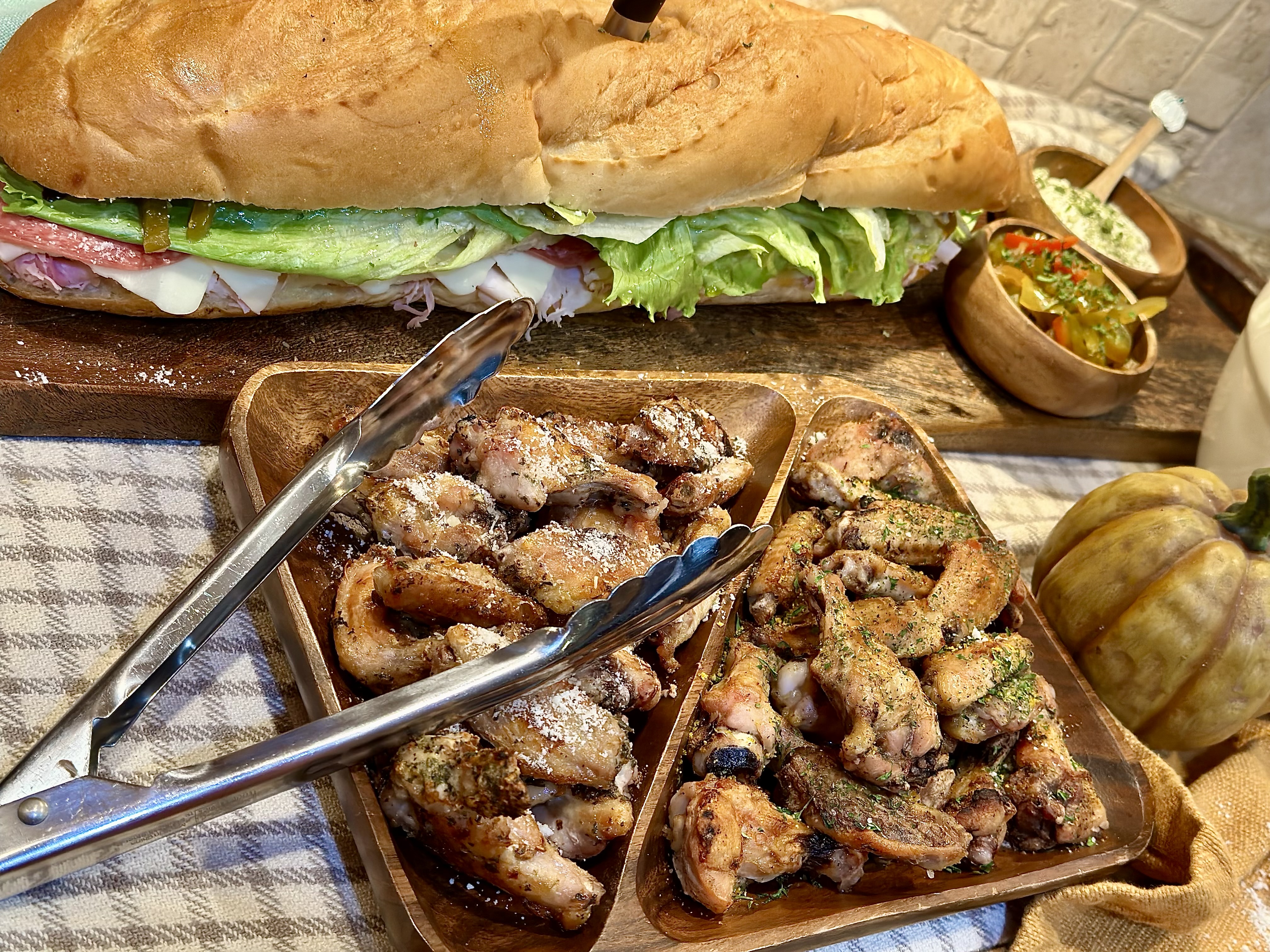 Savory seasoned chicken wings and an incredible hoagie piled high with the good stuff.