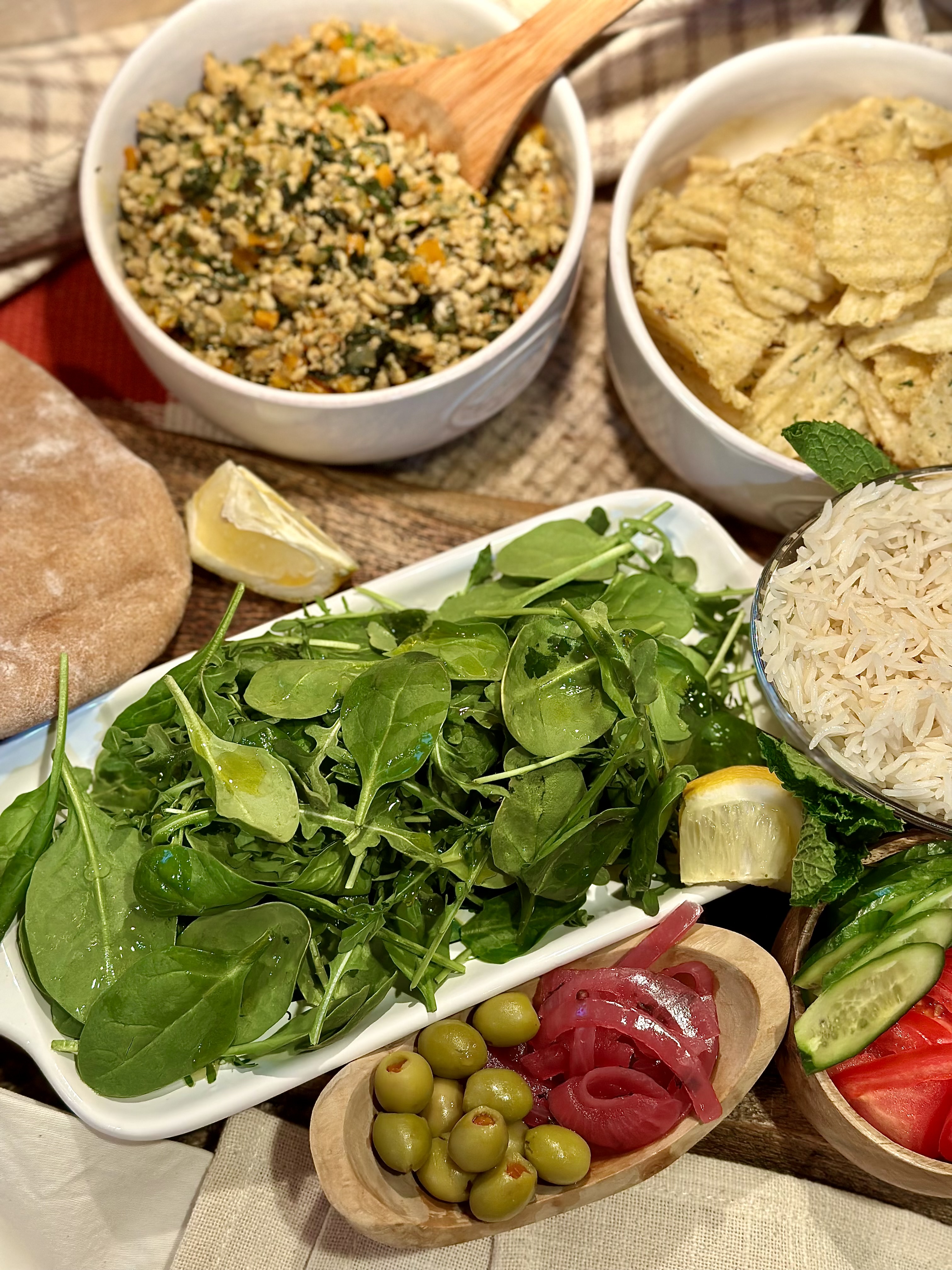 - Leafy greens belong in pitas like chocolate belongs in peanut butter. It just works and it’s a phenomenal, yet a sneaky way to get your picky eaters to eat their fiber! I chose to serve a spinach and arugula mix, but you can use whatever you prefer. Red leaf lettuce and romaine are great options as well! PRO TIP: Pour olive oil and a squeeze of lemon juice on your greens. It helps them to become even more bright and inviting!