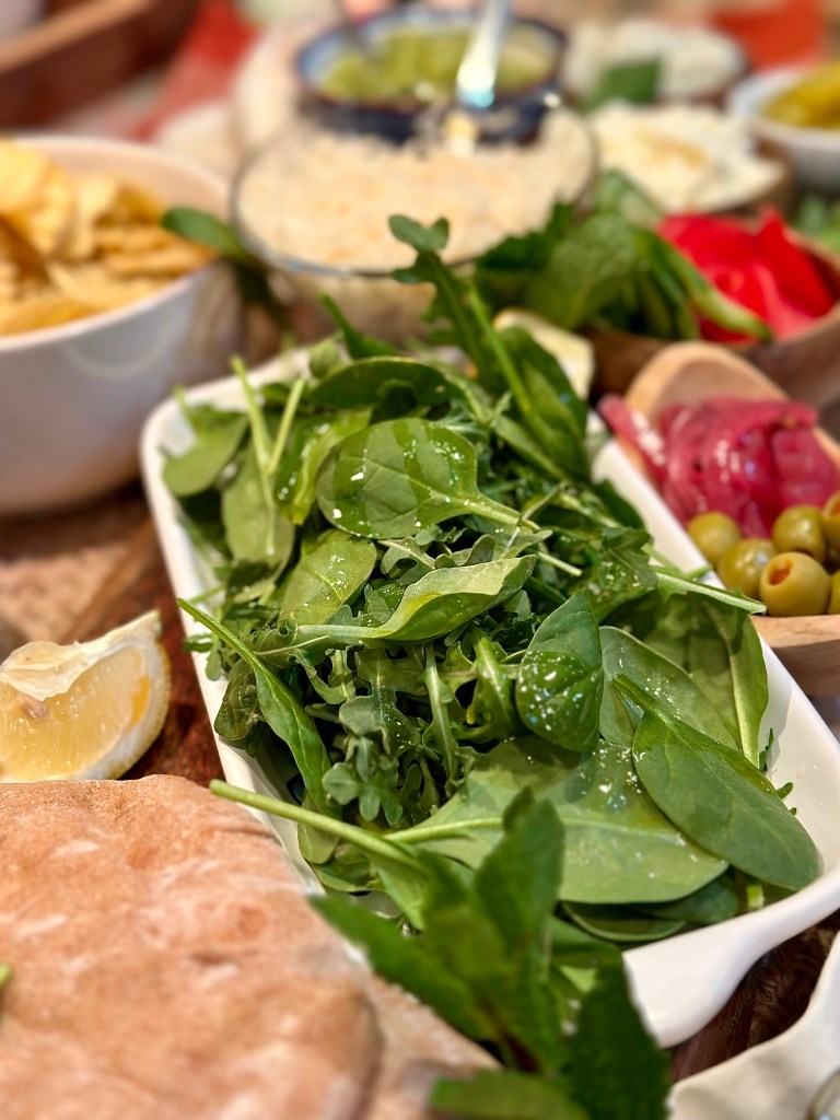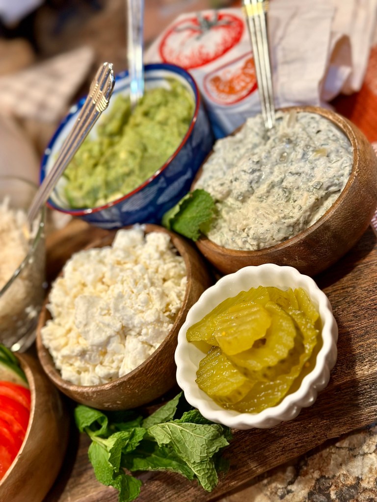 - Spinach parmesan tzatziki. This Greek dressing goes without saying for this spread. However, I went ahead and chose a bit of a flavor switch up because that’s always fun for guests and your palette, of course.