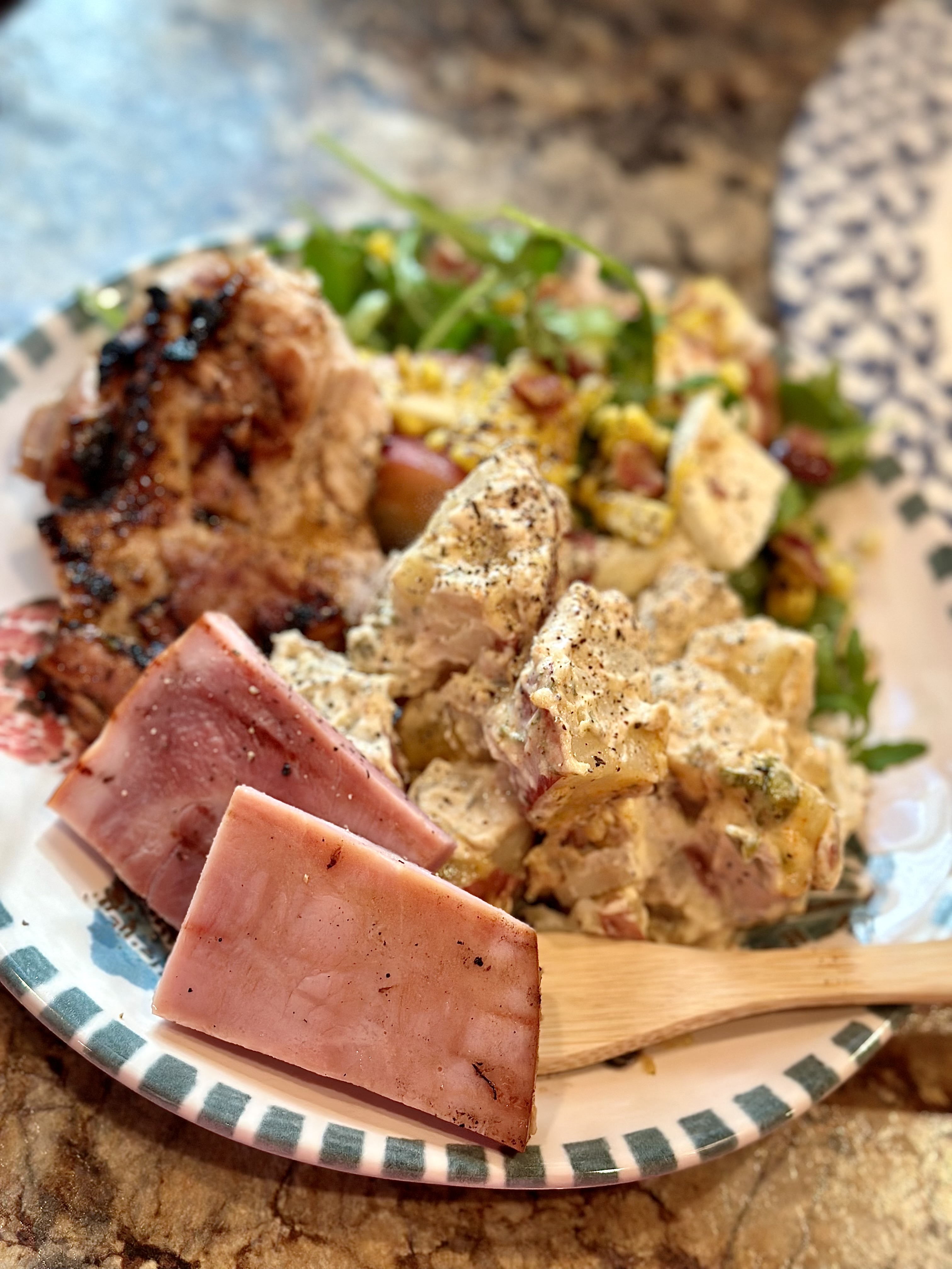 Being that the corn was grilled, I wanted to continue that flavor with the rest of the meal to feel like you’re at a backyard barbecue in the Hamptons. What’s better than marinated chicken thighs, ham steaks, and herbed potato salad accompanied by the most sensational summer salad you ever did see.. or eat! A particular plate where you’re combining glorious charred meats along with different types of salads and putting your plate together like this reminds me of a Thanksgiving meal. That meal is the epitome of Fall. Whereas, this pretty, perfect picture of art right here is the epitome of Summer. If you’re not feeling an entire meal like the one you see my family and I enjoyed so much, you can air fry some chicken wings, fingers, or nuggets to pair along side. You can even cook up a patty and cut into strips to serve right on top to turn this salad into a meal itself.