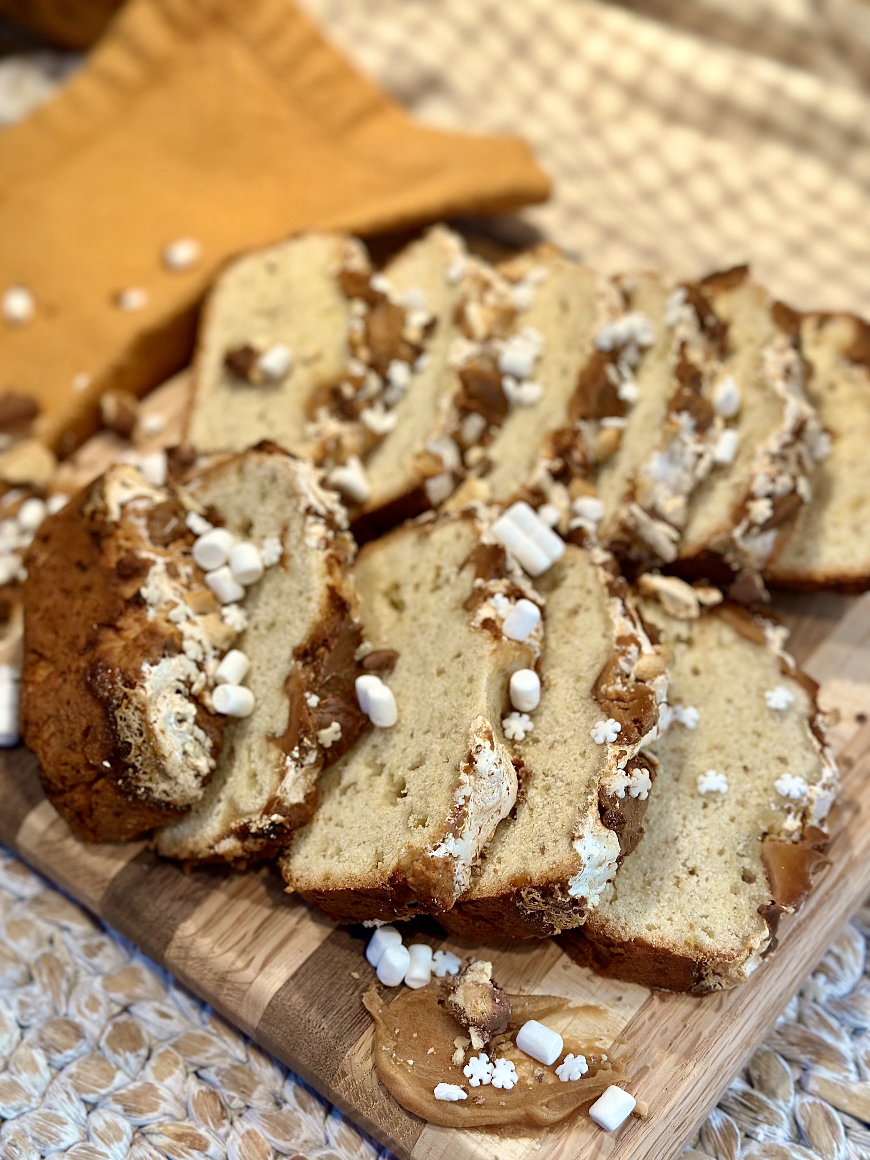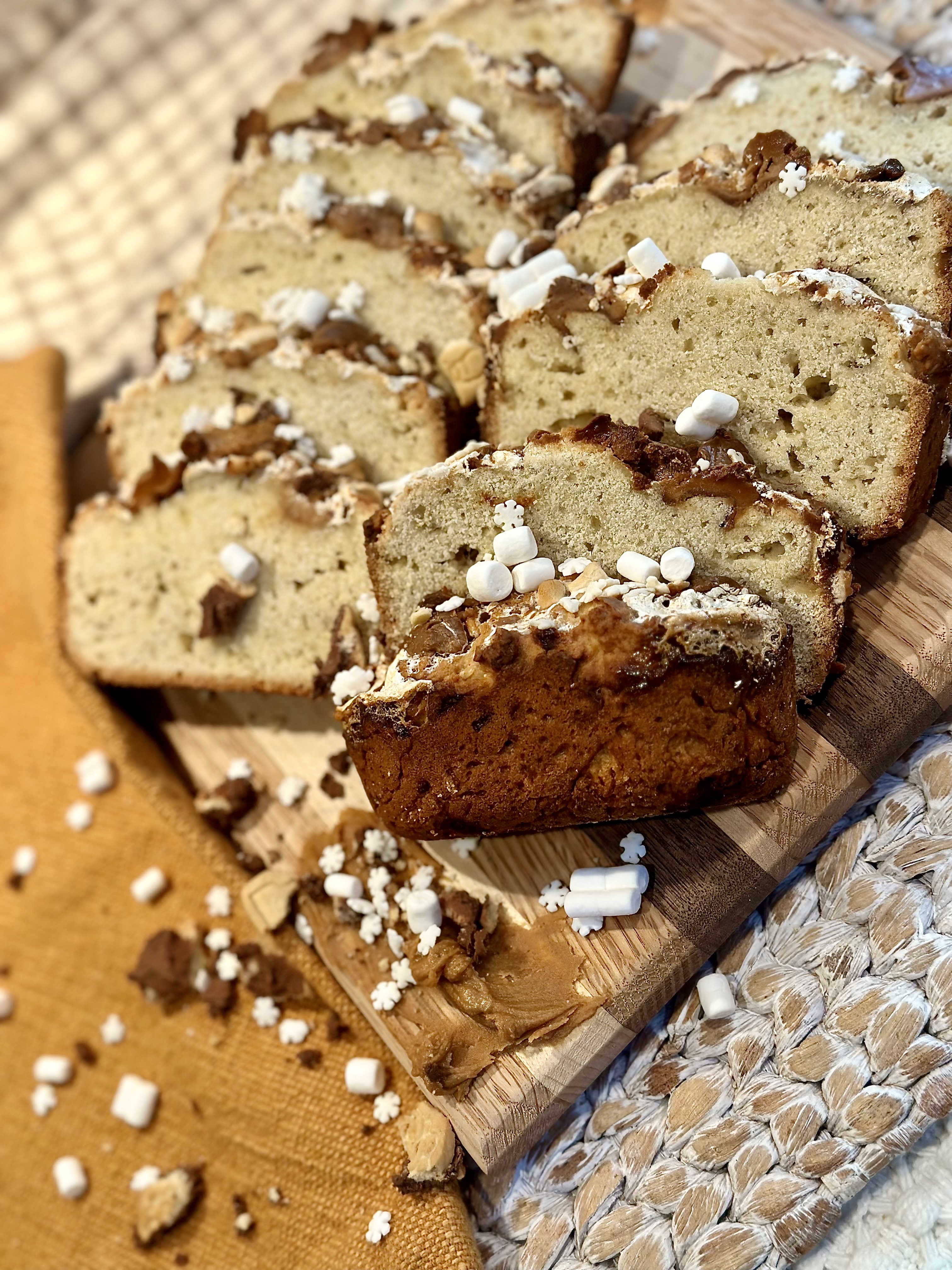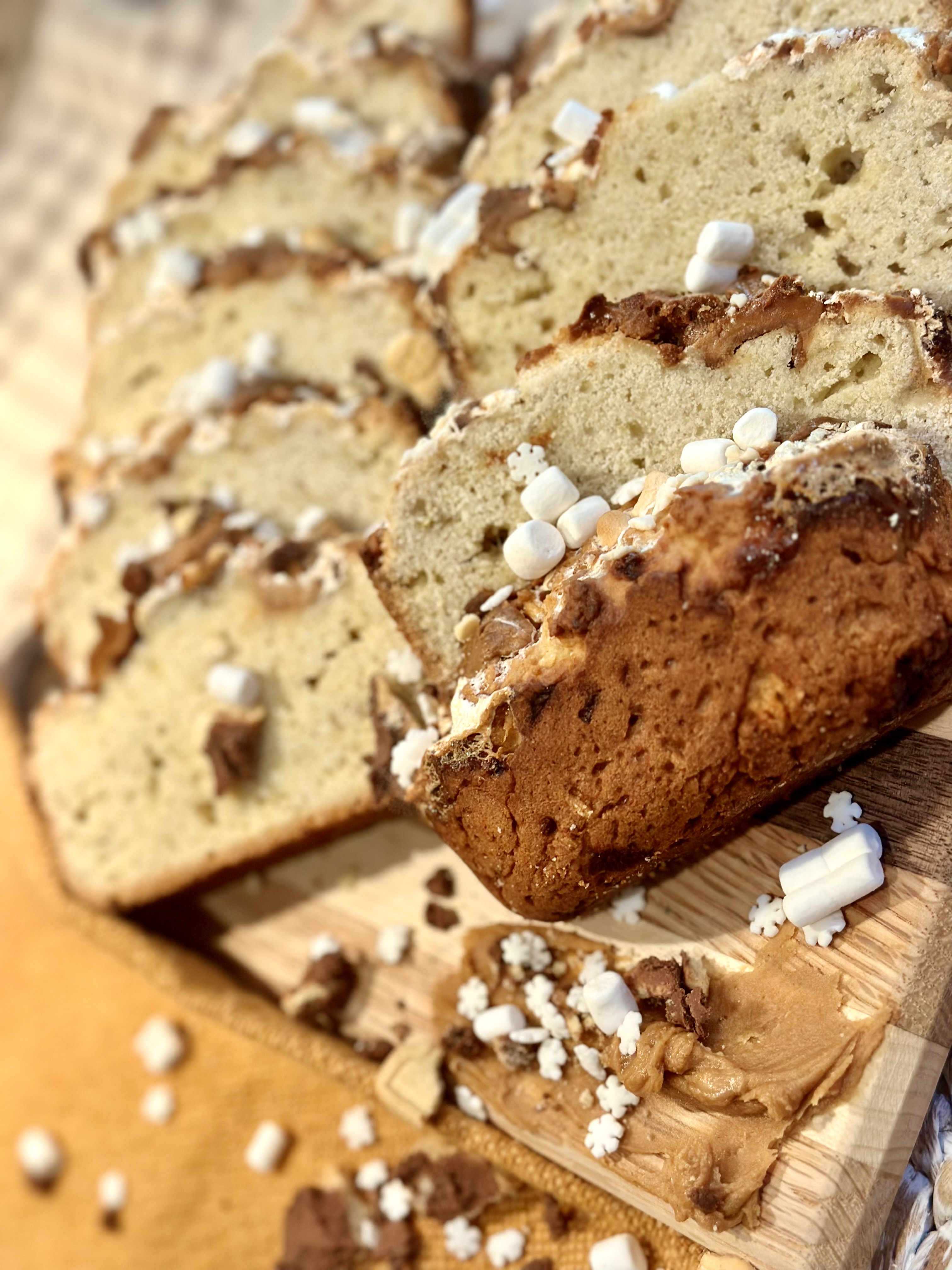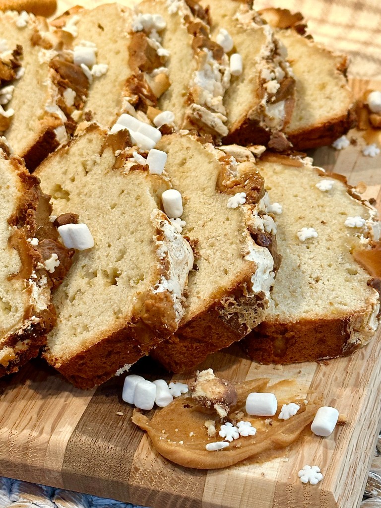 - When serving a crowd, or even just your loved ones that you live with; placing piles of the peanut butter that you used in the loaf, along with more sprinkles and marshmallows are the perfect addition to your serving techniques. Food is not just about eating to live, it’s about living, it’s about enjoying life in it’s fullest form, so when consuming food, especially a sweet delicacy, the way it’s presented is so extremely important to me. Think about when you dine out at a restaurant.. you’re sipping a glass of something bubbly, buttering a fluffy slice of bread, and your plate comes out, it’s looking absolutely stunning, but what if it wasn’t? You would be highly disappointed with a great feeling of how you just wasted your money. The same should go for when you make your own food. Impress yourself! Make yourself feel like you’re in your own little restaurant! Romanticize your meals!
