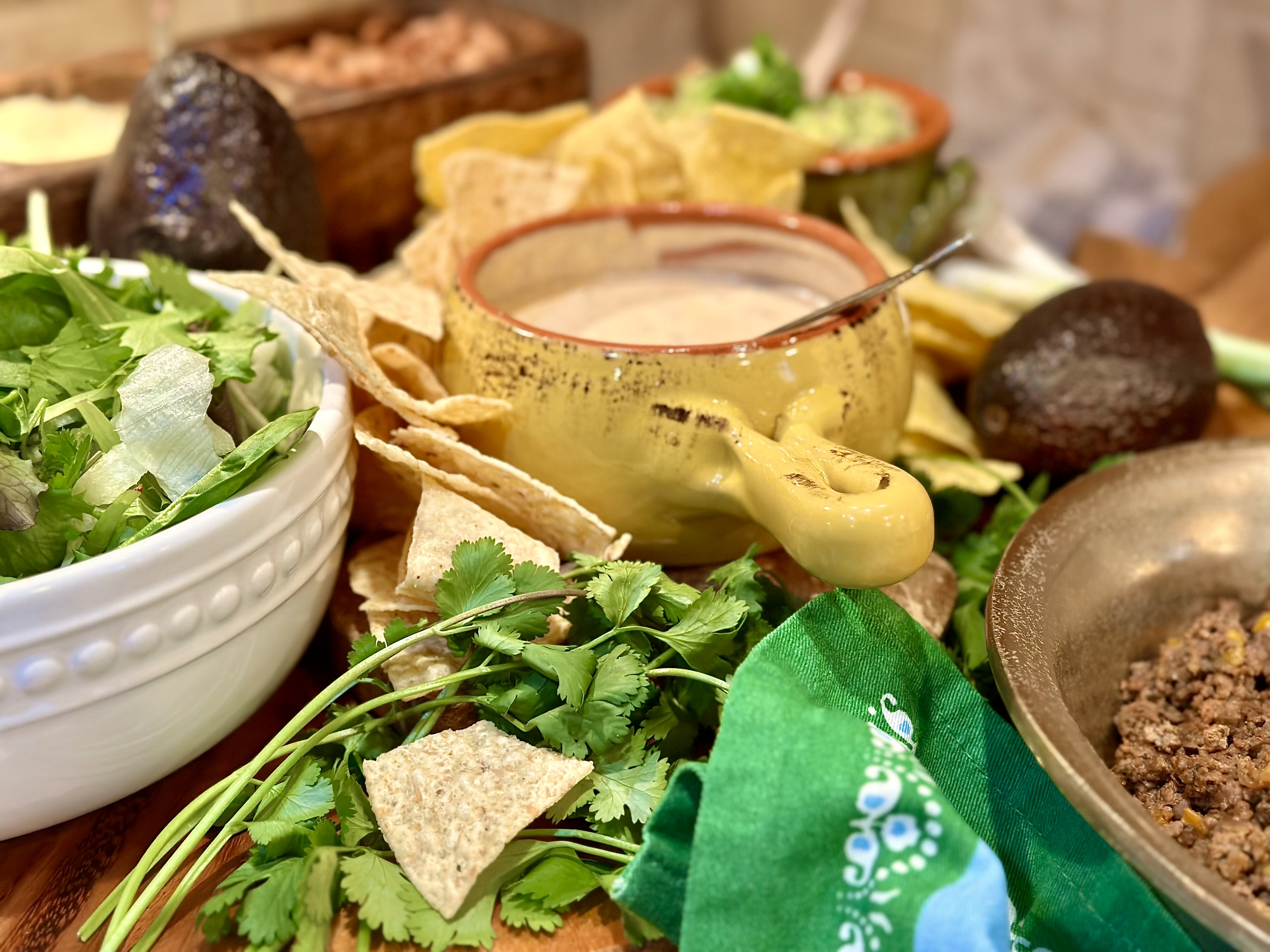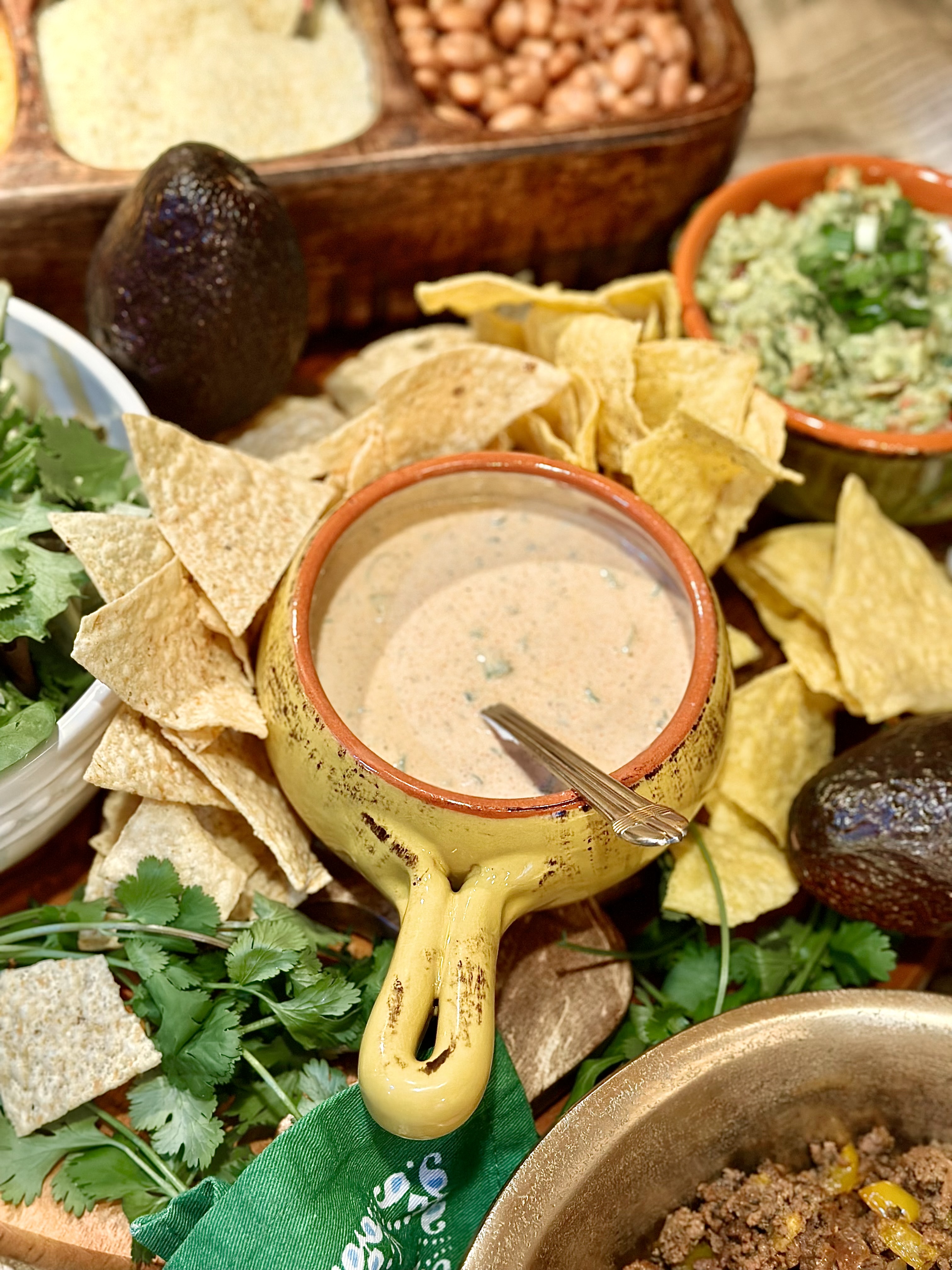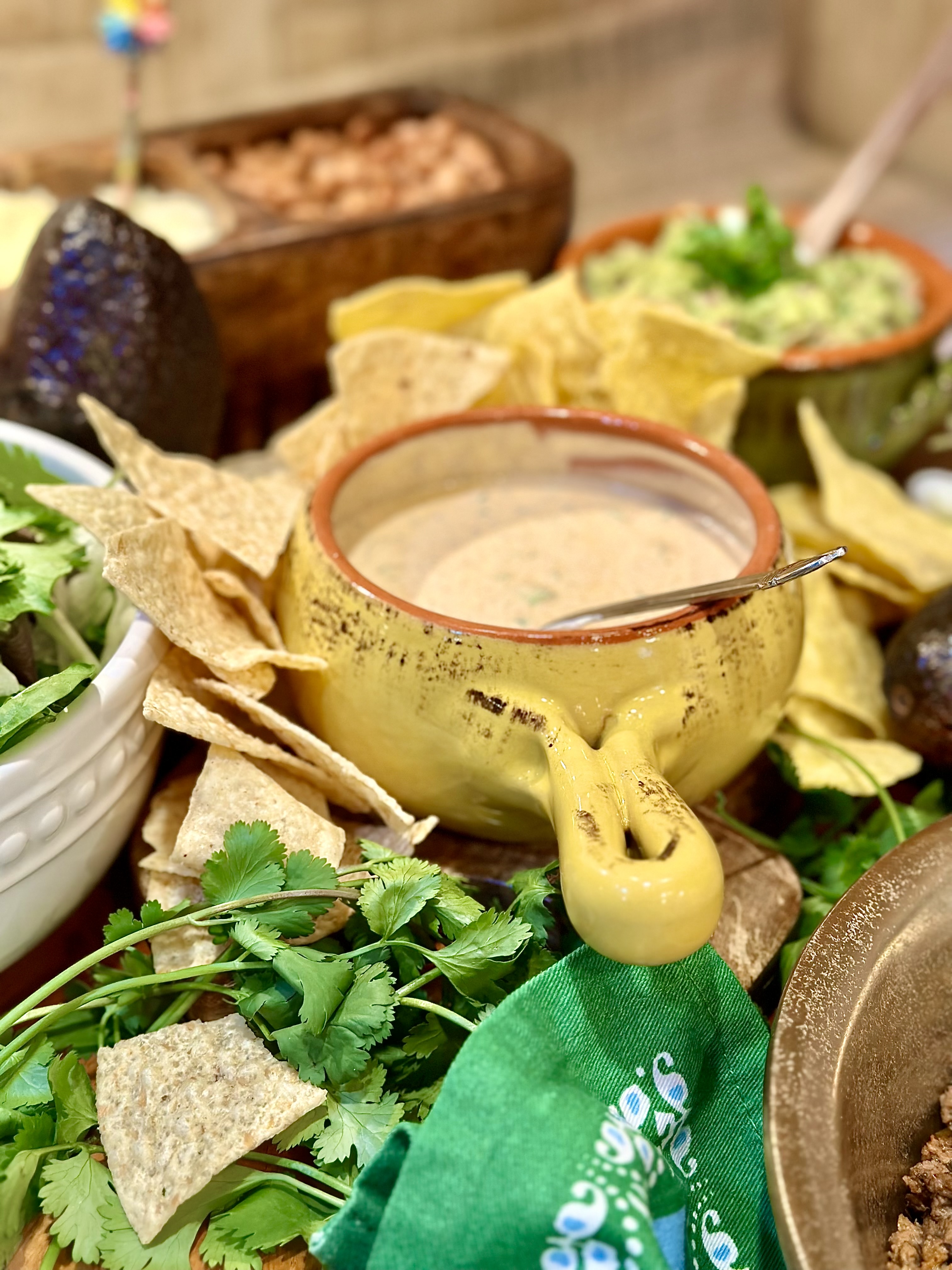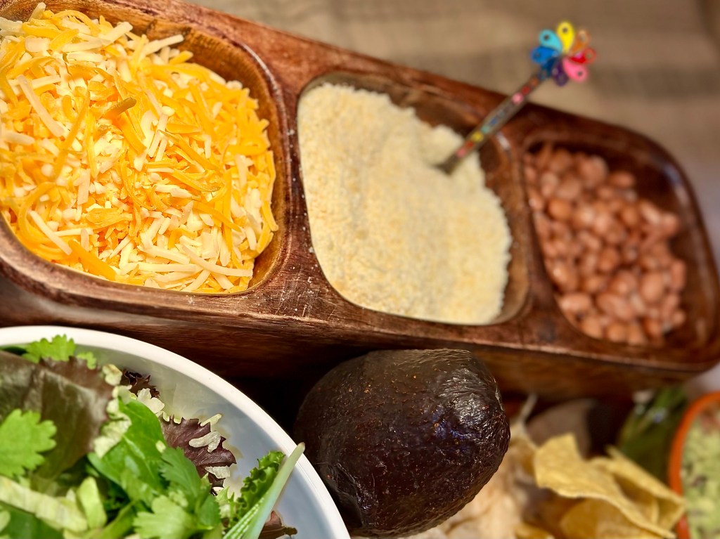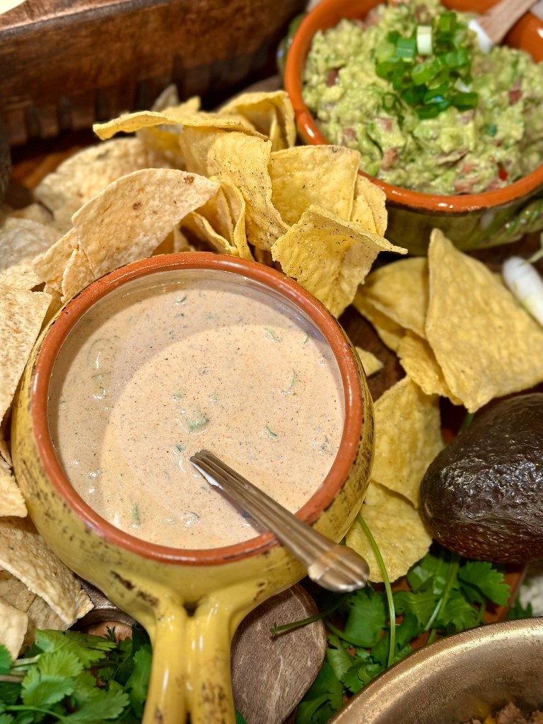 - Tortilla chips! I actually served up two kinds! An authentic sea salt, along with a queso seasoned chip that I spotted in the “new section” of the chip aisle!