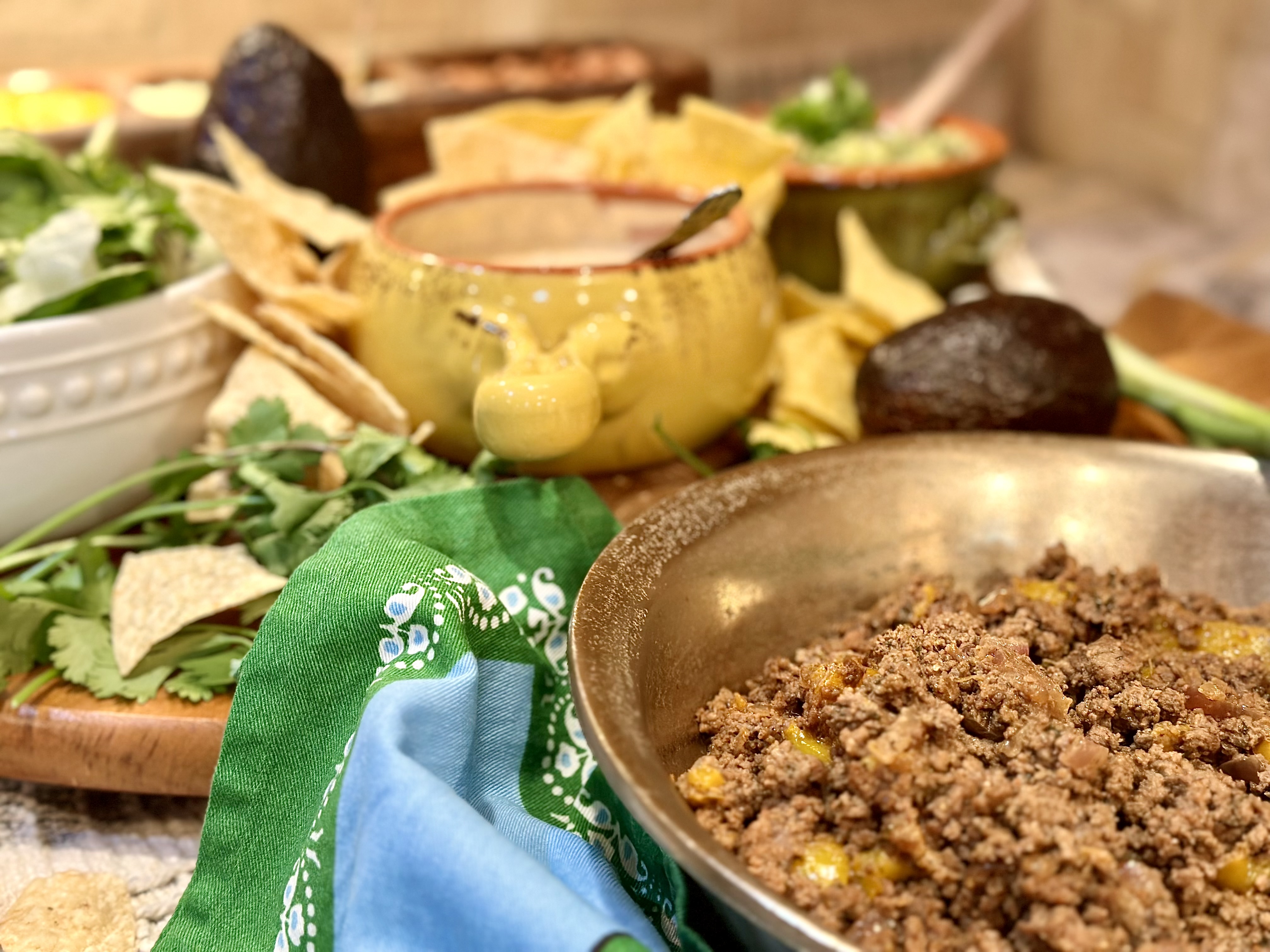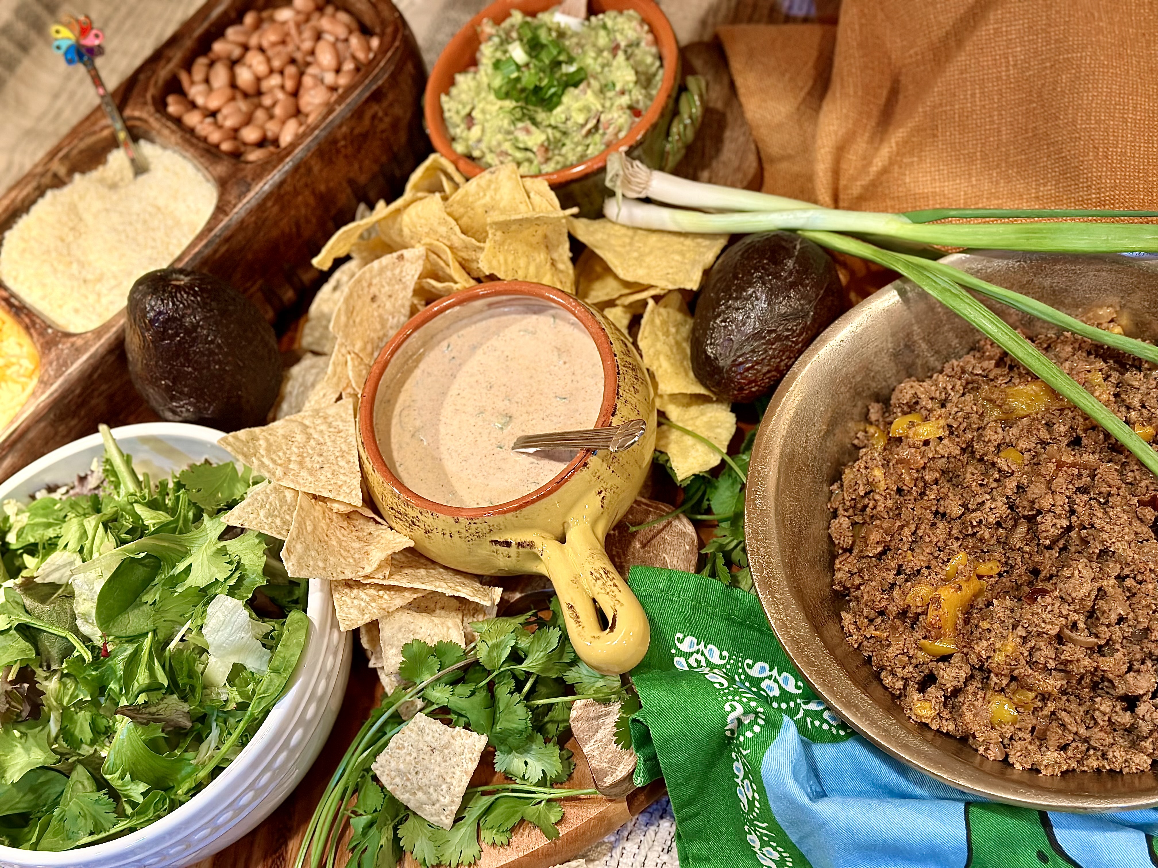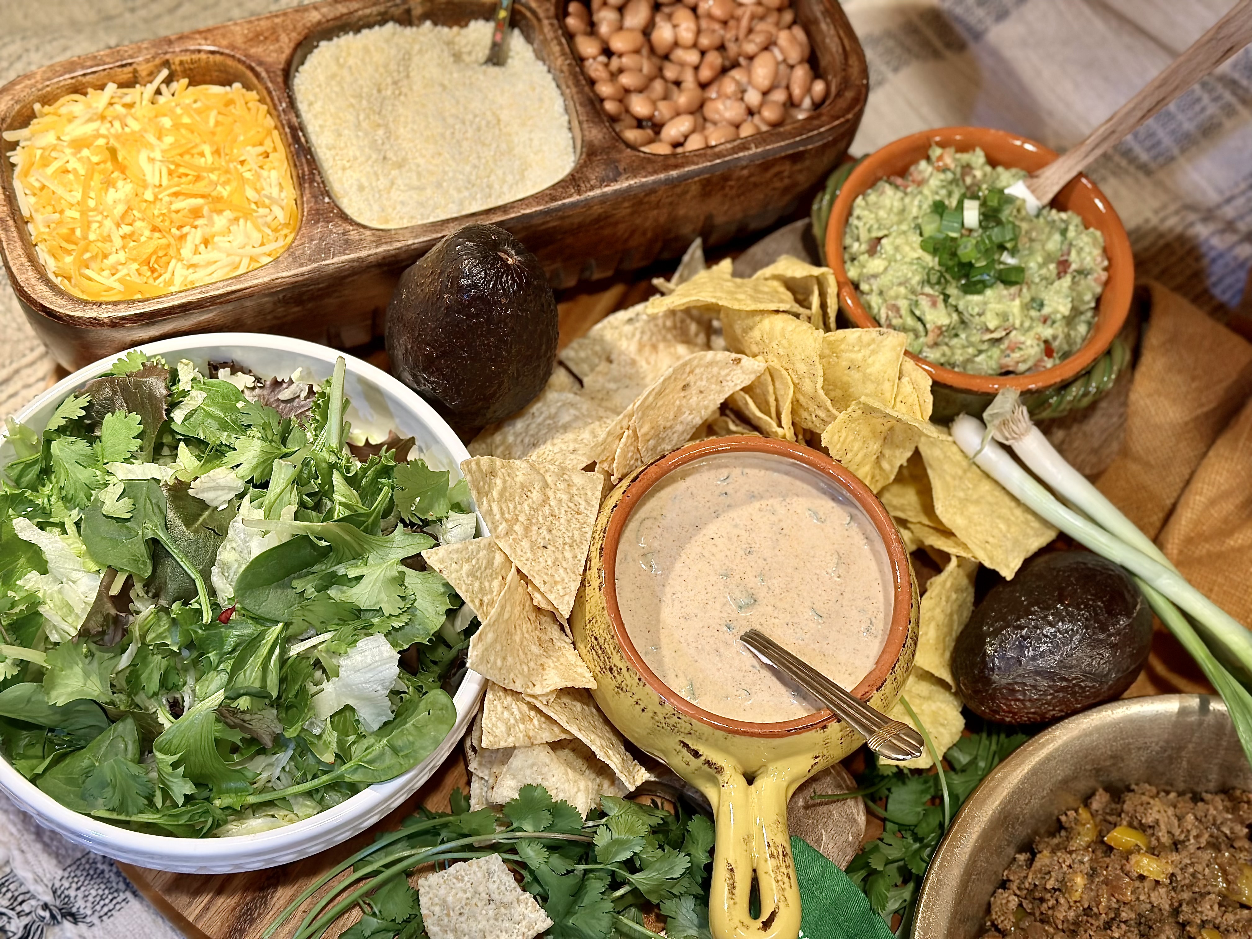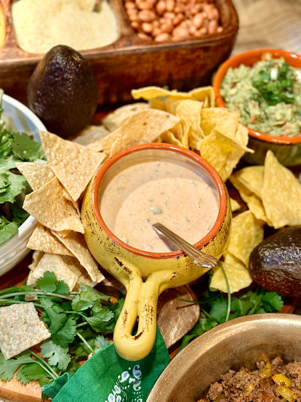 - Tortilla chips! I actually served up two kinds! An authentic sea salt, along with a queso seasoned chip that I spotted in the “new section” of the chip aisle!
