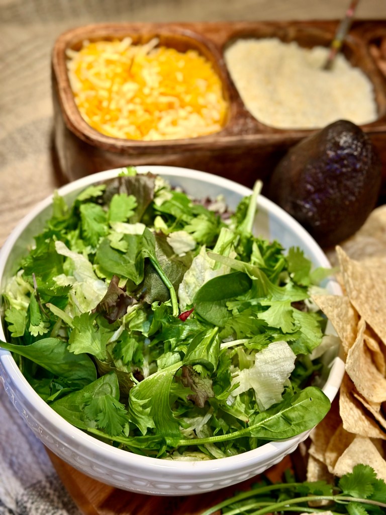 - Mixed greens! Toss together iceberg for that crisp, cold crunch we all enjoy when it comes to feasting on fabulous tacos, and a bag of spring mix because well.. it is spring after all!