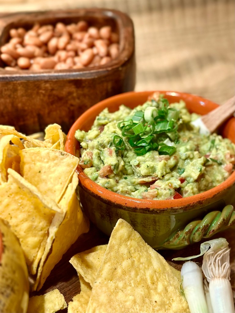 - Freshly made guacamole! I don’t make mine as strong as I used to with fresh garlic gloves, red onions, and jalapeños. As I’ve grown older, my stomach got sensitive to those ingredients, so instead I mash in green onions, chipotle hot sauce, chili powder, and tons of fresh cilantro. Of course you can’t have guacamole without some diced Roma tomatoes either!