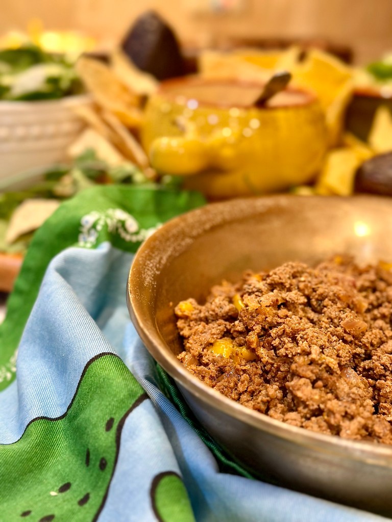 - Taco meat because what is a taco salad without the meat? You can use ground chicken, turkey, or chicken, and then of course use a taco seasoning packing with the appropriate amount of water in which the package calls for, or you can season the meat yourself just as I always do. I have so many recipes on here going through the seasonings that you’ll need to create a Mexican seasoning blend!